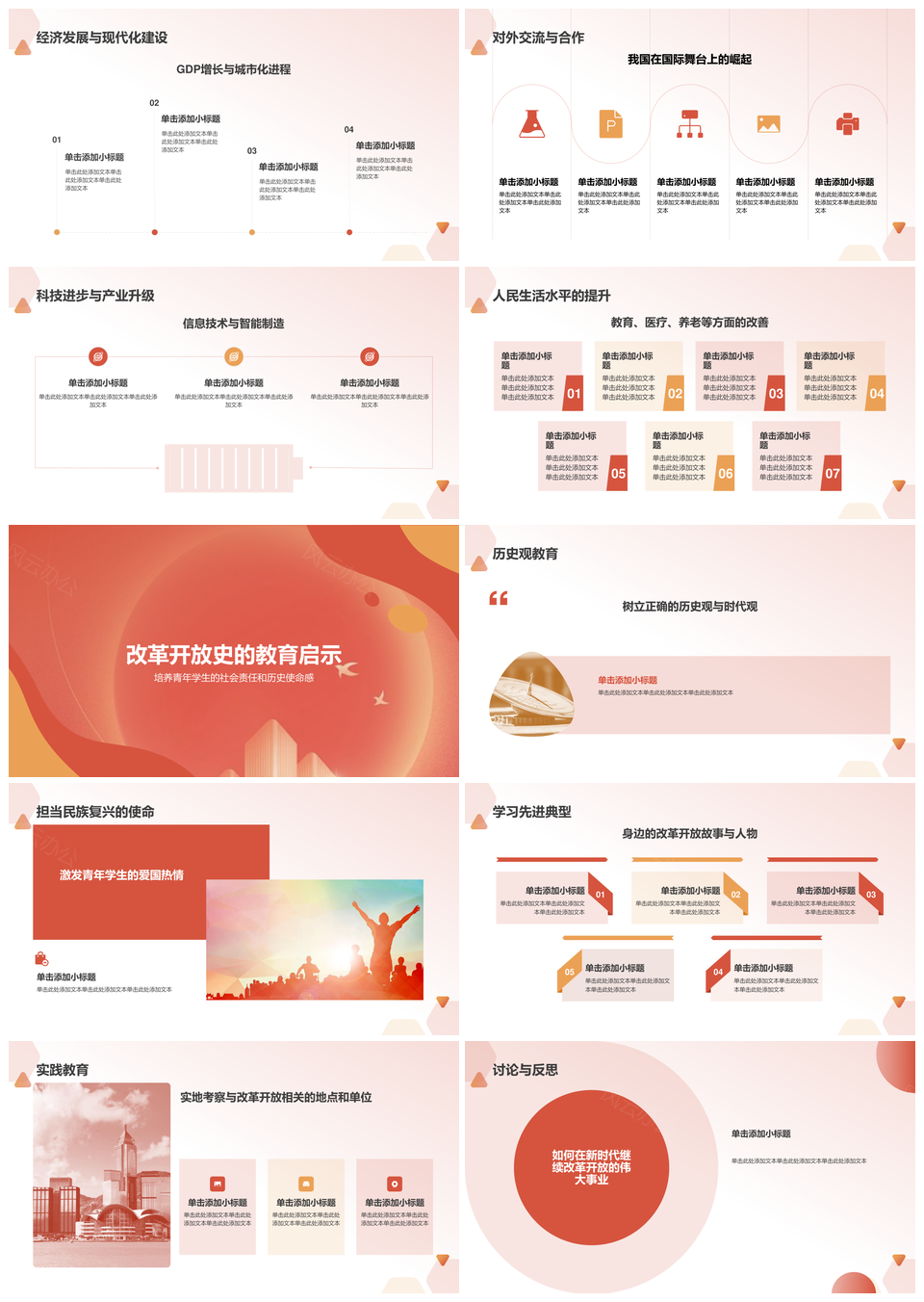 这是一张改革开放四史引领中华民族小康富强胜利发展PPT模板,包含改革开放、四史、引领、中华民族、小康、富强、胜利、发展等主题内容,也可用作改革开放四史引领中华民族小康富强、改革开放四史引领小康富强胜利、改革开放引领中华民族小康富强、四史引领中华民族小康富强、中华民族小康富强胜利发展、改革开放小康富强胜利发展、四史引领中华民族胜利发展、改革开放引领小康富强胜利、四史引领小康富强胜利、中华民族小康富强胜利、改革开放小康富强胜利、四史引领胜利发展、改革开放引领发展、小康富强胜利发展、引领中华民族发展等PPT场景使用。 风云办公提供的改革开放四史引领中华民族小康富强胜利发展PPT模板,下载格式为pptx,一共19页,作品中文字及图均可以修改和编辑,图片更改请在作品中右键图片并更换,文字修改请直接点击文字进行修改。