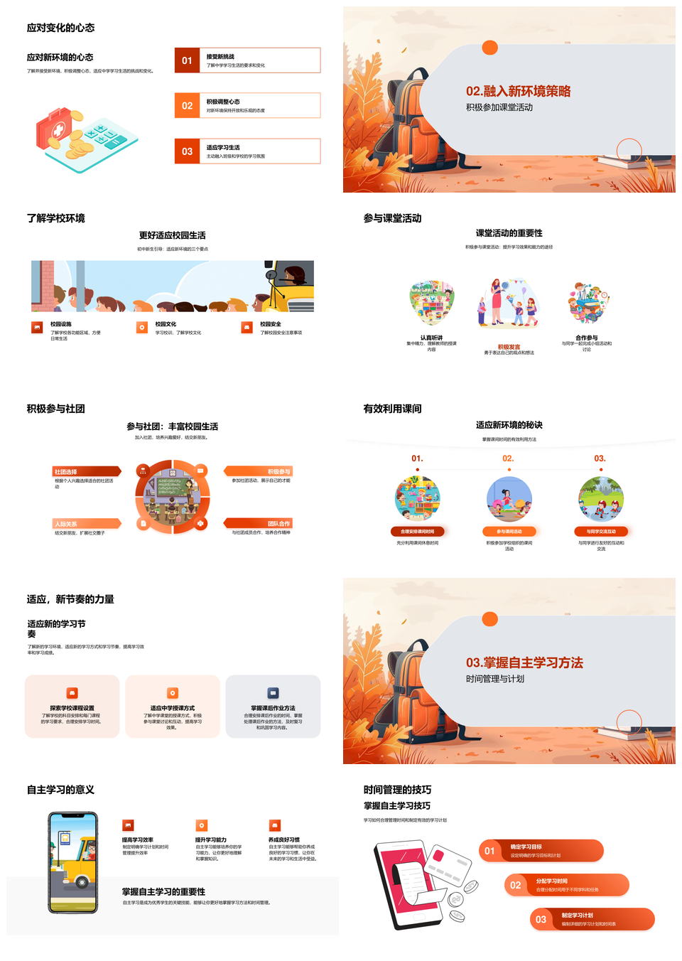 这是一张初一新生适应中学学习时间管理高效计划自主课堂记忆法PPT模板,包含初一新生、适应、中学、学习、时间管理、高效计划、自主课堂、记忆法等主题内容,也可用作初一新生适应中学、新生适应中学学习、适应中学学习时间管理、中学学习时间管理高效、学习时间管理高效计划、时间管理高效计划自主、高效计划自主课堂、计划自主课堂记忆法、适应中学学习时间管理高效、学习时间管理高效计划自主、时间管理高效计划自主课堂、高效计划自主课堂记忆法、适应中学学习高效计划、中学学习高效计划自主、高效计划自主课堂记忆法等PPT场景使用。 风云办公提供的初一新生适应中学学习时间管理高效计划自主课堂记忆法PPT模板,下载格式为pptx,一共33页,作品中文字及图均可以修改和编辑,图片更改请在作品中右键图片并更换,文字修改请直接点击文字进行修改。