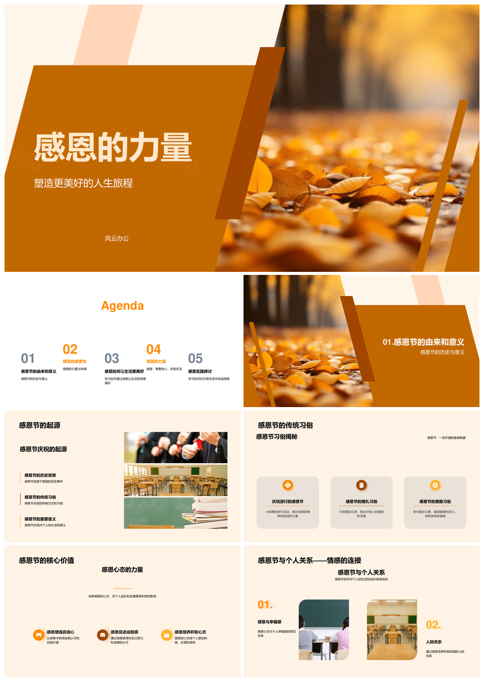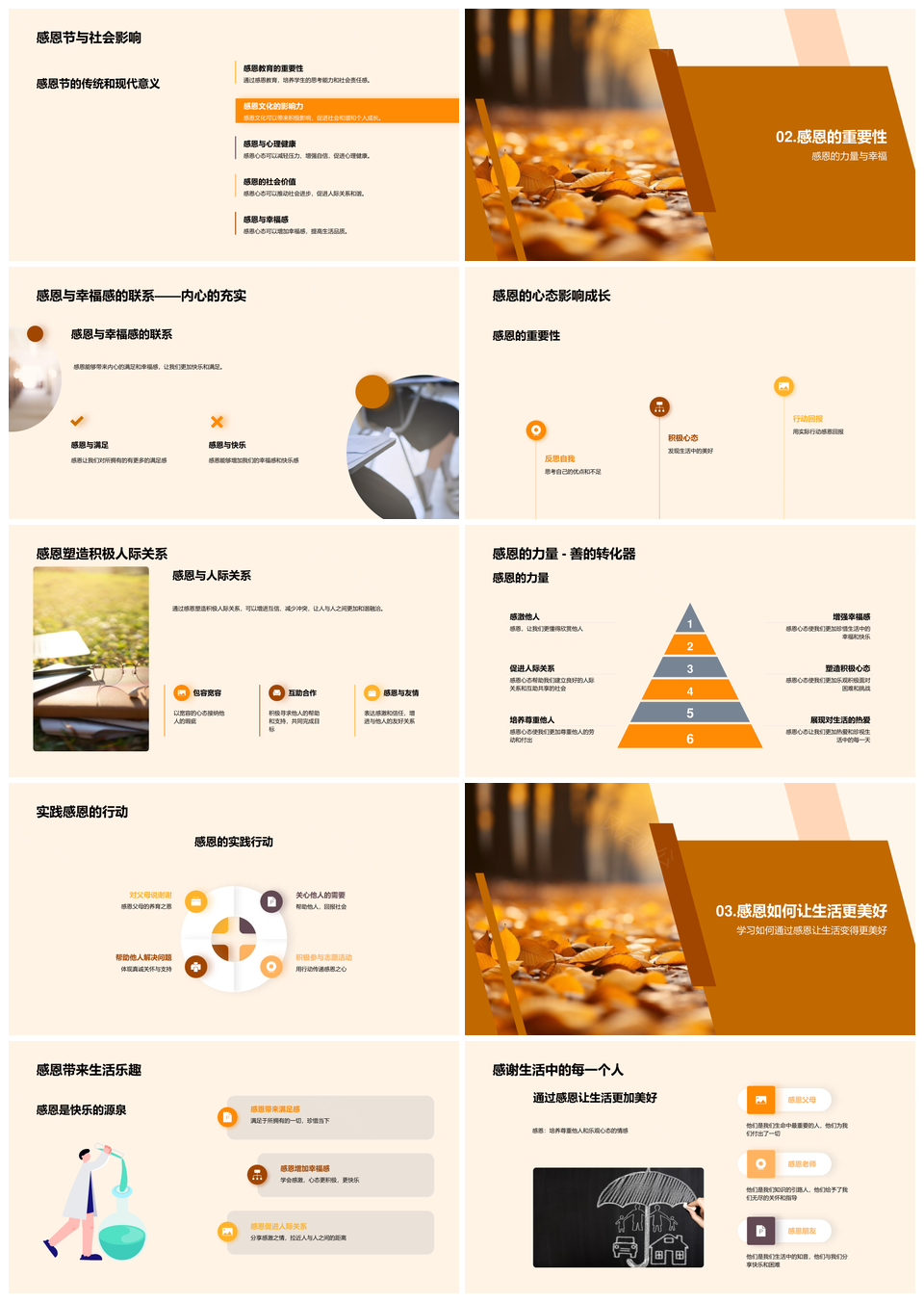 风云办公提供的感恩教育培塑秋叶幸福人生心念PPT模板,下载格式为pptx,一共33页,作品中文字及图均可以修改和编辑,图片更改请在作品中右键图片并更换,文字修改请直接点击文字进行修改。