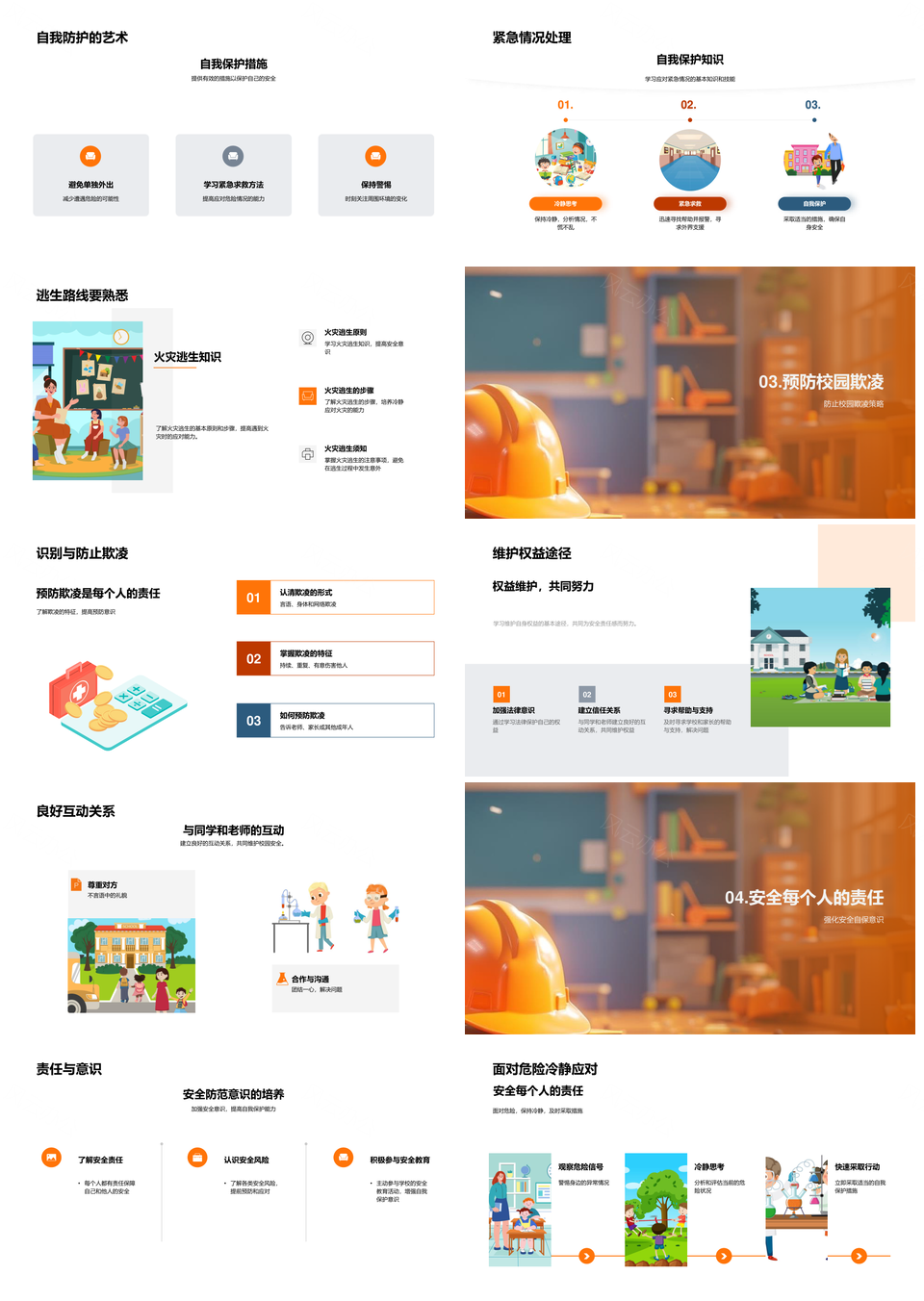 这是一张校园安全防范自救教育手册PPT模板,包含校园、安全、防范、自救、教育、手册等主题内容,也可用作校园安全防范自救、安全防范自救教育、防范自救教育手册、校园安全教育手册、校园安全自救教育、安全防范教育手册、安全自救教育手册、校园安全防范、校园安全教育、校园安全自救、安全防范自救、安全防范教育、安全自救教育、校园安全、安全防范等PPT场景使用。