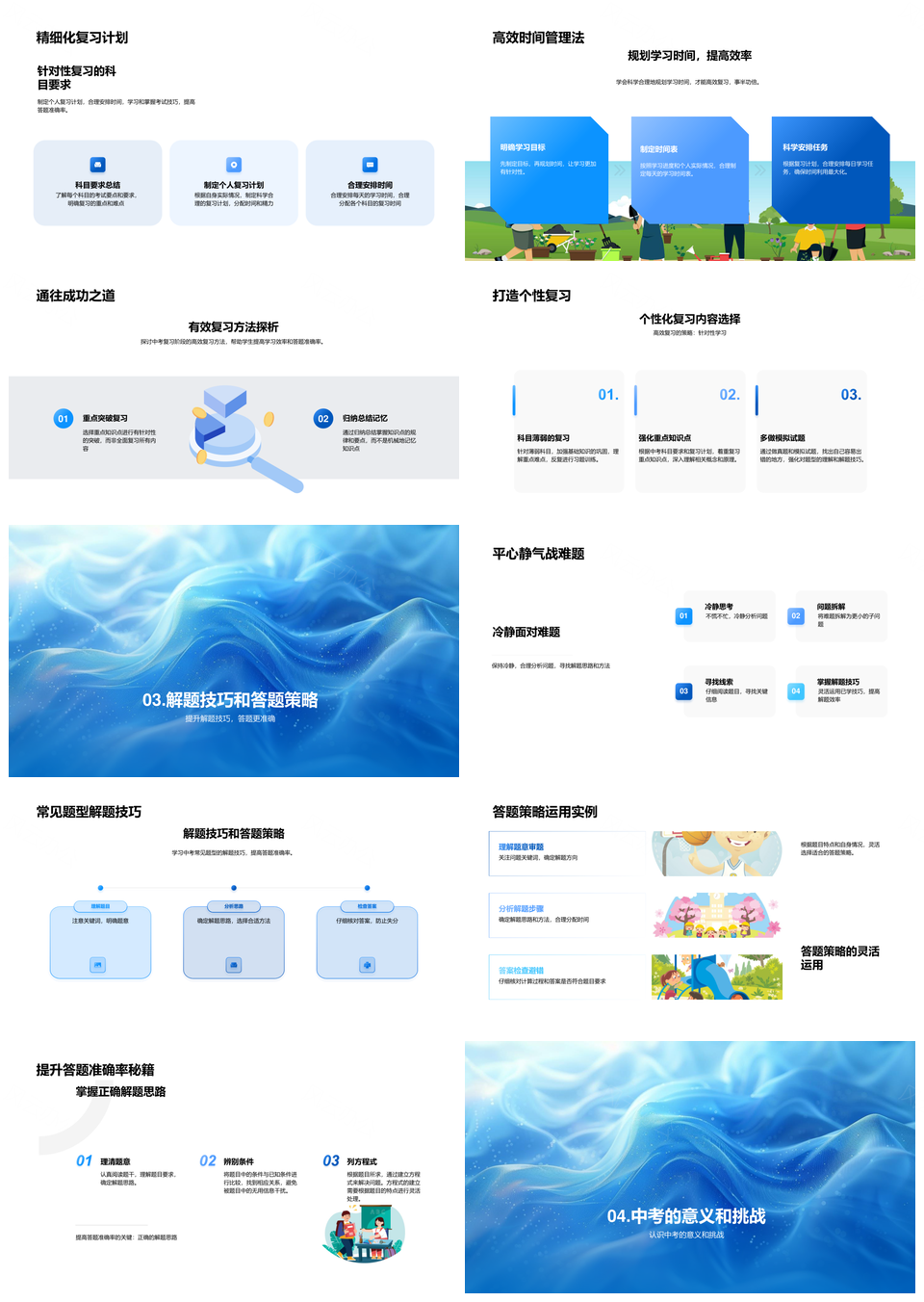 这是一张中考备考科目解析复习策略时间管理解题技巧PPT模板,包含中考、备考、科目、解析、复习、策略、时间管理、解题技巧等主题内容,也可用作中考备考科目解析、备考科目解析复习策略、科目解析复习策略时间管理、解析复习策略时间管理解题技巧、中考备考科目、备考科目解析、科目解析复习策略、解析复习策略时间管理、复习策略时间管理解题技巧、中考备考、备考科目、科目解析、解析复习策略、复习策略时间管理、时间管理解题技巧等PPT场景使用。 风云办公提供的中考备考科目解析复习策略时间管理解题技巧PPT模板,下载格式为pptx,一共27页,作品中文字及图均可以修改和编辑,图片更改请在作品中右键图片并更换,文字修改请直接点击文字进行修改。