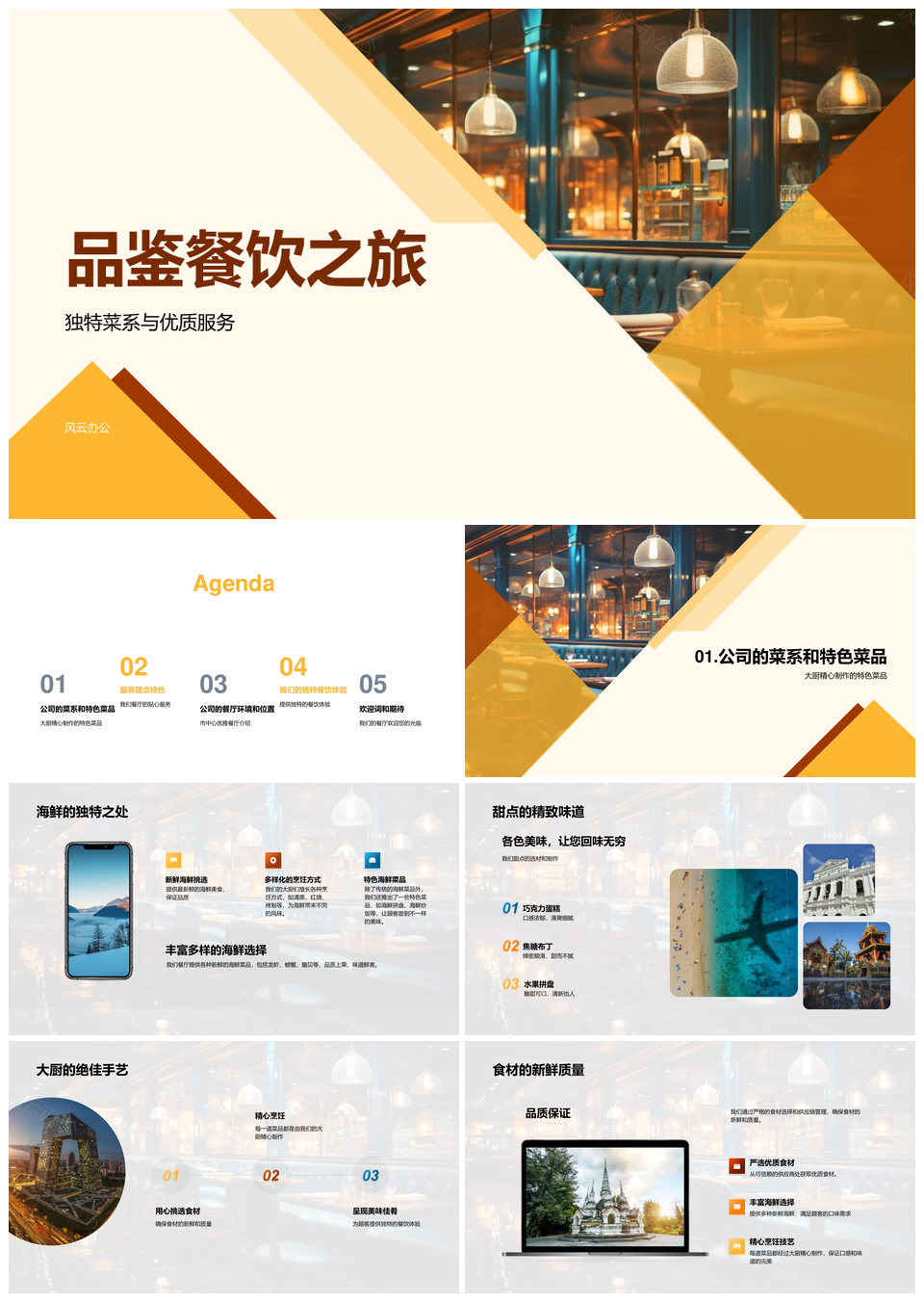 风云办公提供的鲜材海鲜甜点独特菜系臻享品鉴之旅PPT模板,下载格式为pptx,一共32页,作品中文字及图均可以修改和编辑,图片更改请在作品中右键图片并更换,文字修改请直接点击文字进行修改。