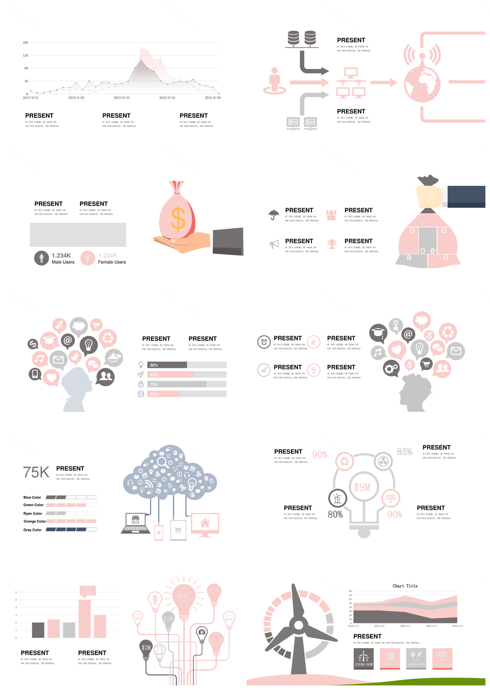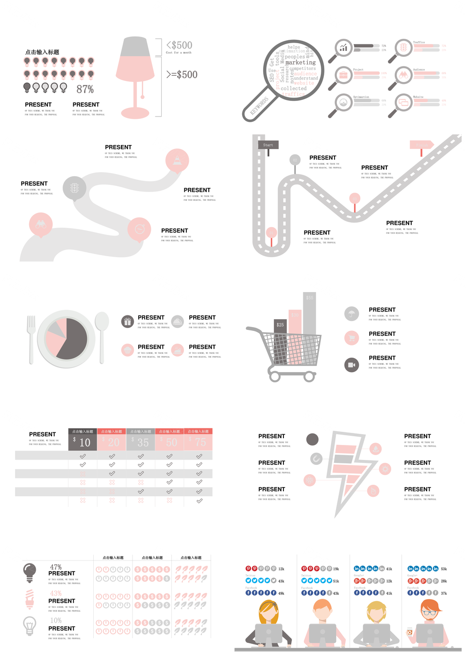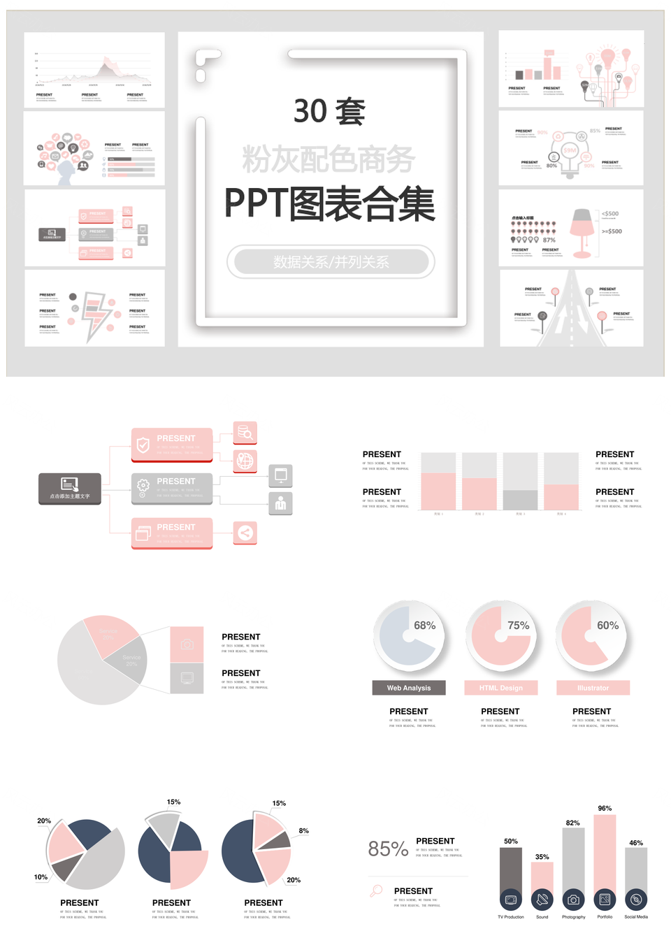 风云办公提供的粉灰配色商务数据关系并列关系PPT图表合集,下载格式为pptx,一共31页,作品中文字及图均可以修改和编辑,图片更改请在作品中右键图片并更换,文字修改请直接点击文字进行修改。