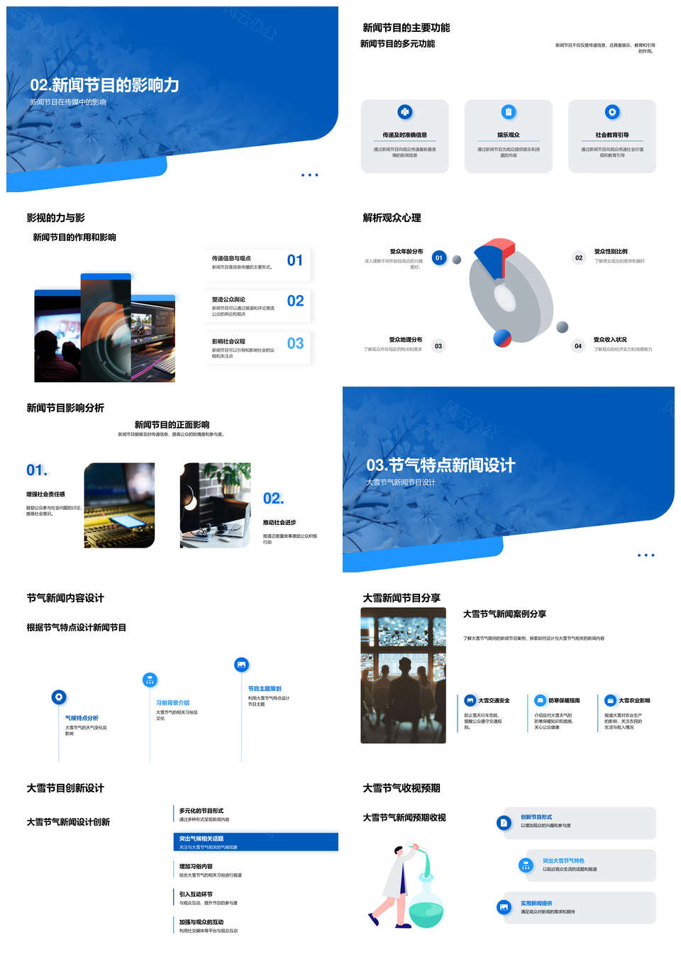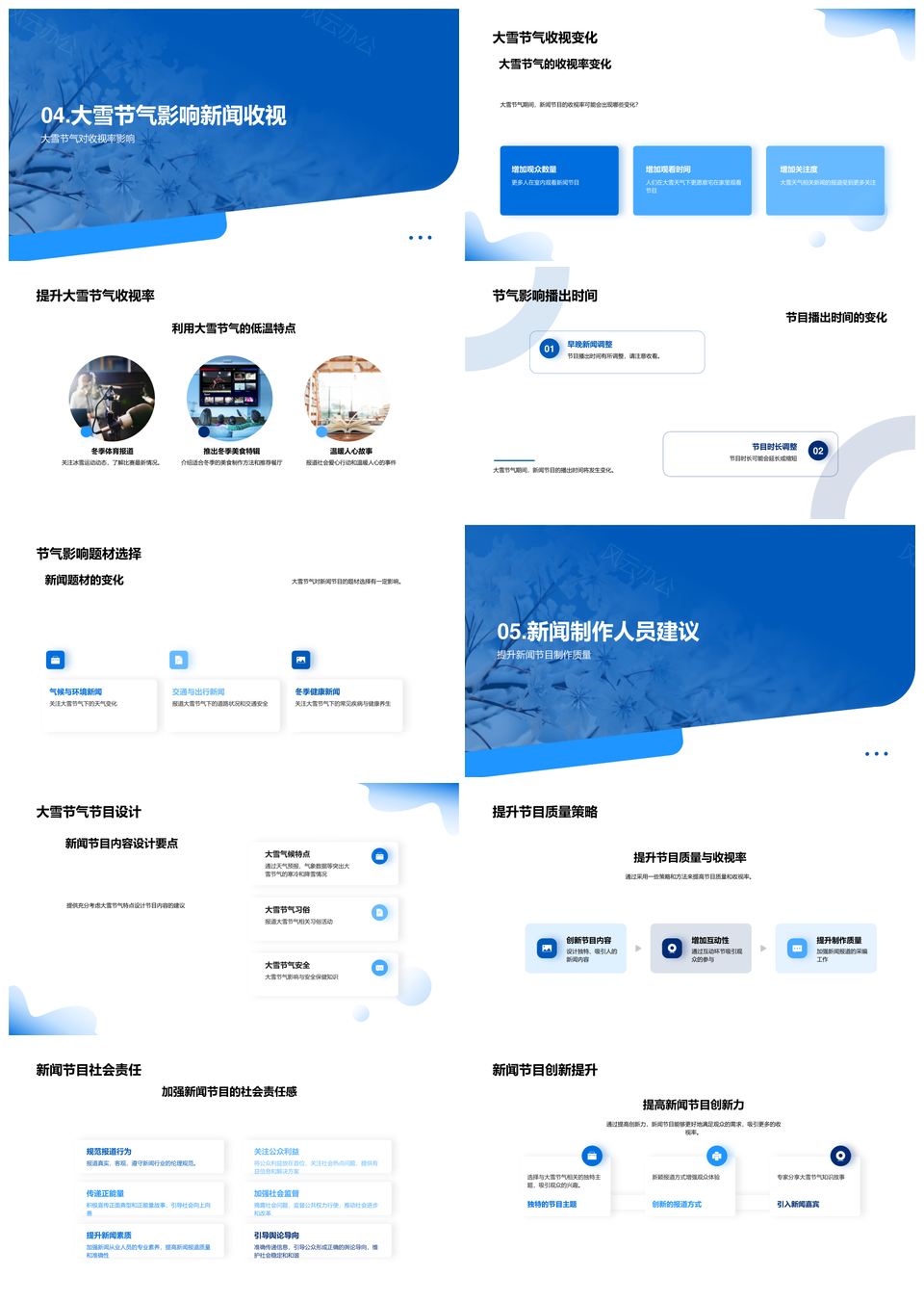 这是一张大雪节气新闻节目设计提升传统媒体收视率PPT模板,包含大雪节气、新闻节目、设计、提升、传统媒体、收视率等主题内容,也可用作大雪节气新闻节目设计、节气新闻节目设计提升、新闻节目设计提升传统媒体、节目设计提升传统媒体收视率、大雪节气新闻节目、节气新闻节目设计、新闻节目设计提升、节目设计提升传统、设计提升传统媒体、提升传统媒体收视率、大雪节气新闻、节气新闻节目、新闻节目设计、节目设计提升、设计提升传统等PPT场景使用。 风云办公提供的大雪节气新闻节目设计提升传统媒体收视率PPT模板,下载格式为pptx,一共28页,作品中文字及图均可以修改和编辑,图片更改请在作品中右键图片并更换,文字修改请直接点击文字进行修改。