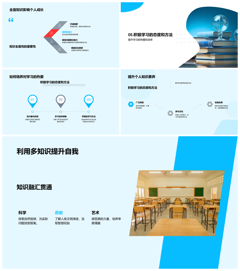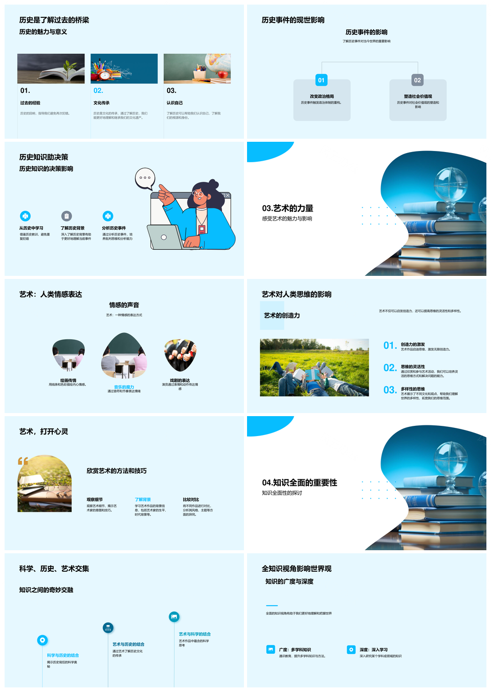 风云办公提供的科学历史艺术全面学习提升素养PPT模板,下载格式为pptx,一共23页,作品中文字及图均可以修改和编辑,图片更改请在作品中右键图片并更换,文字修改请直接点击文字进行修改。