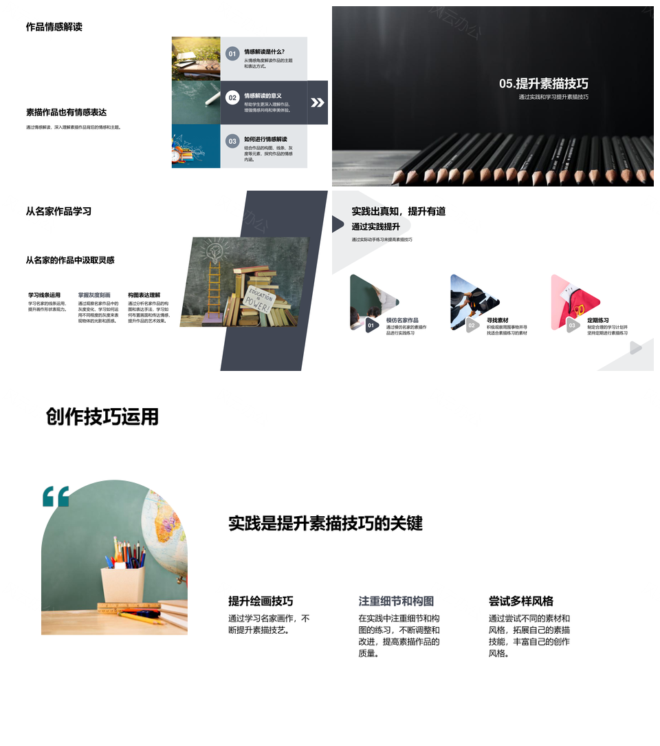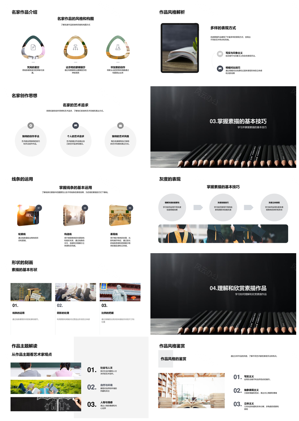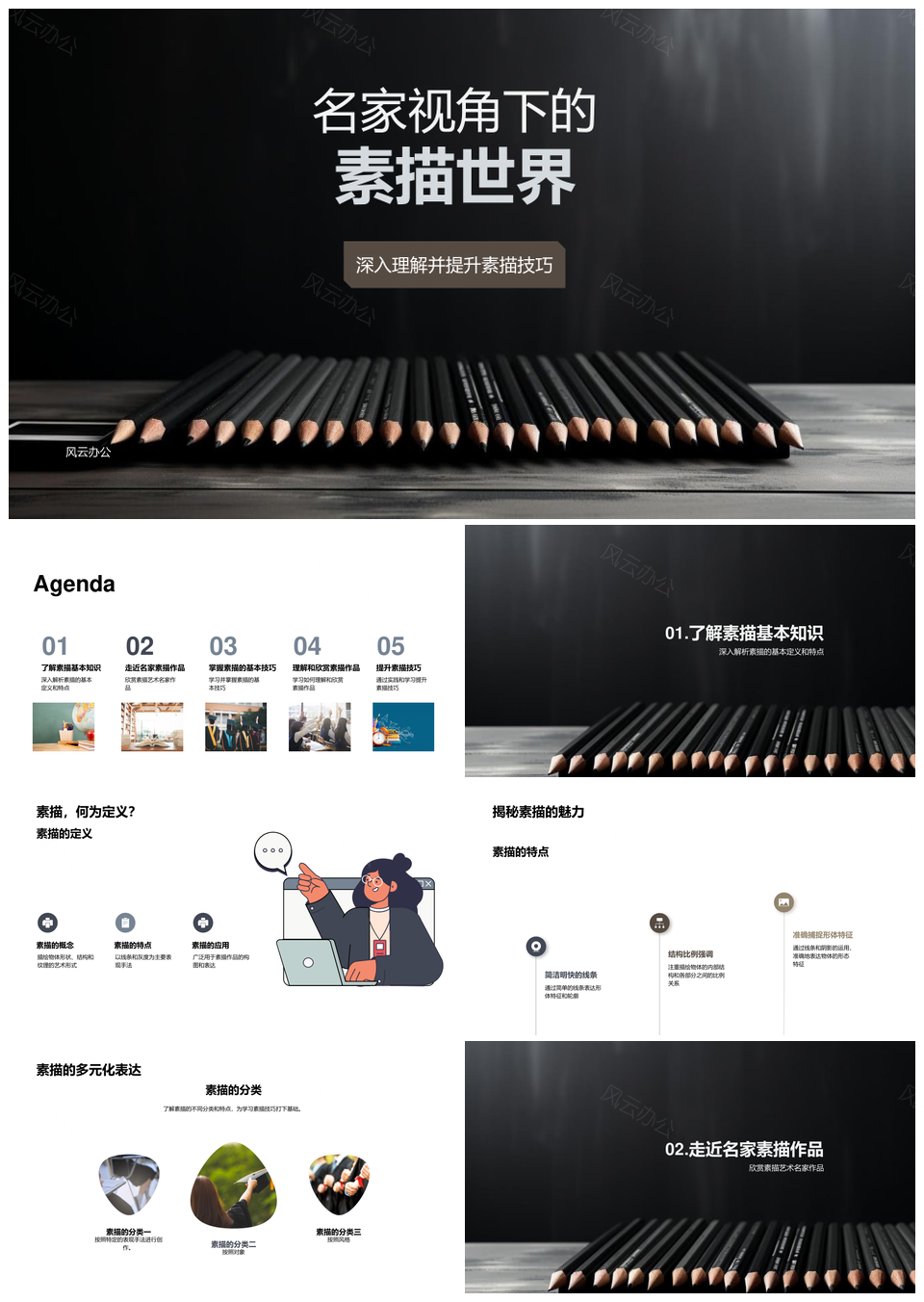 风云办公提供的名家素描技巧风格构图线条灰度解析PPT模板,下载格式为pptx,一共23页,作品中文字及图均可以修改和编辑,图片更改请在作品中右键图片并更换,文字修改请直接点击文字进行修改。