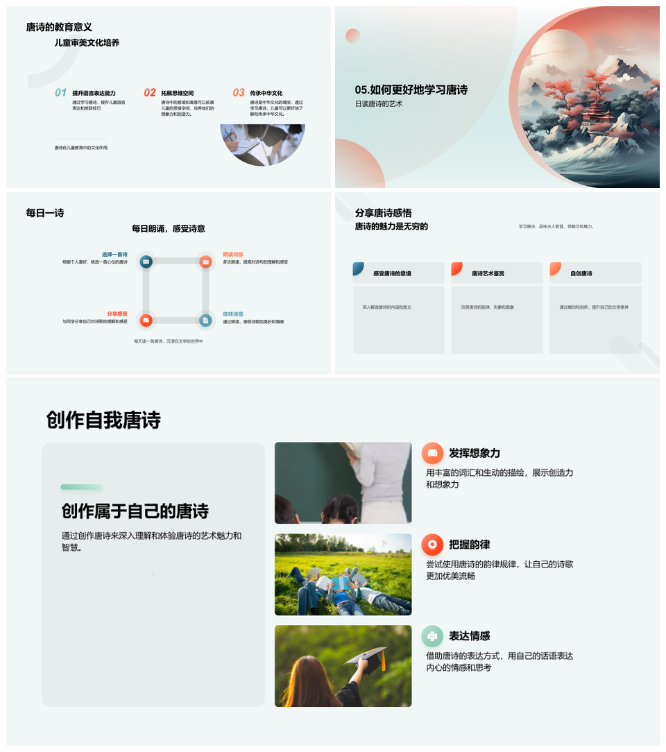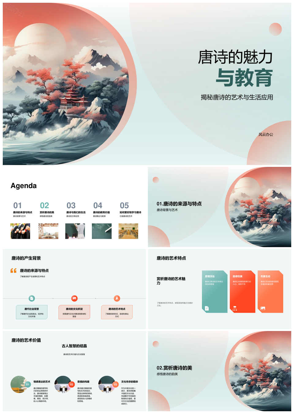风云办公提供的唐诗艺术教育韵美意境寓用古卷PPT模板,下载格式为pptx,一共23页,作品中文字及图均可以修改和编辑,图片更改请在作品中右键图片并更换,文字修改请直接点击文字进行修改。