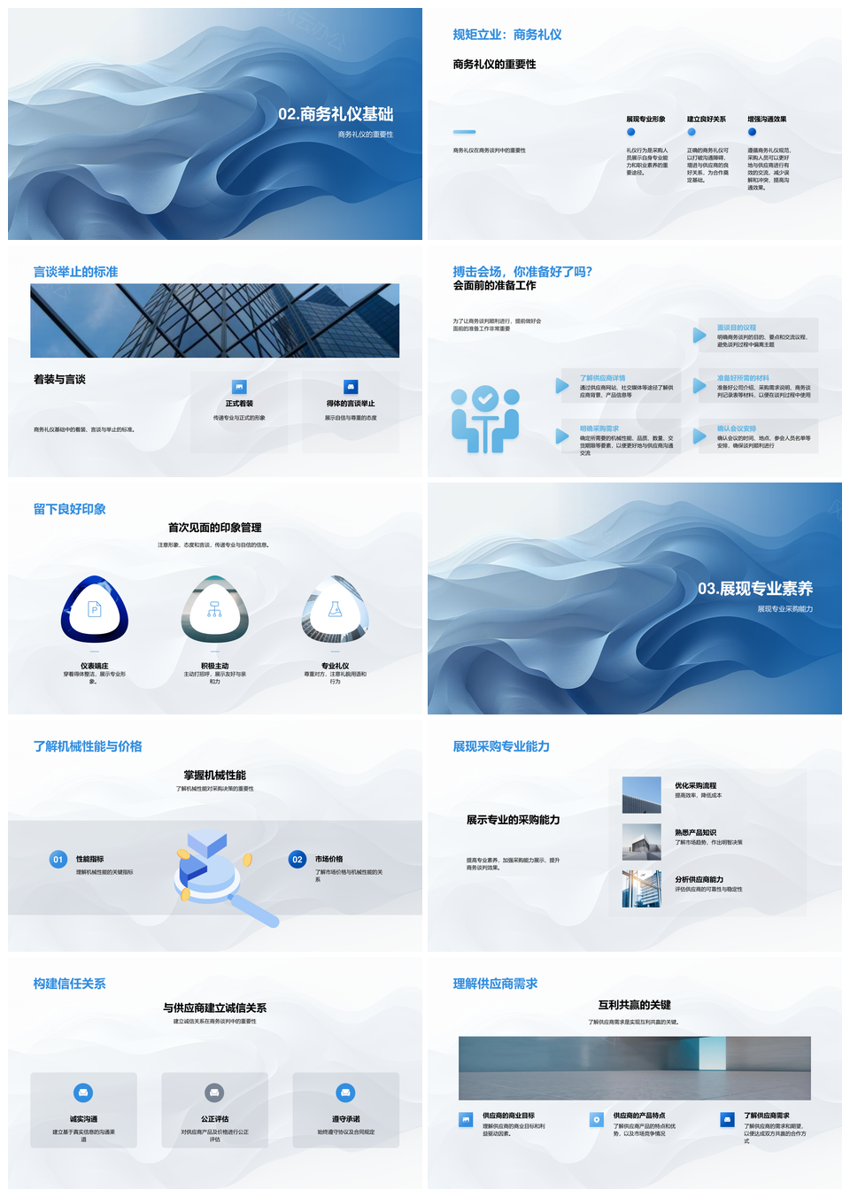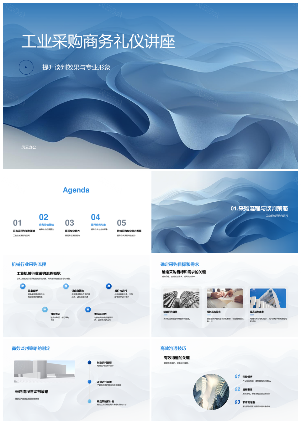 风云办公提供的工业采购商务礼仪谈判策略与采购流程PPT模板,下载格式为pptx,一共28页,作品中文字及图均可以修改和编辑,图片更改请在作品中右键图片并更换,文字修改请直接点击文字进行修改。
