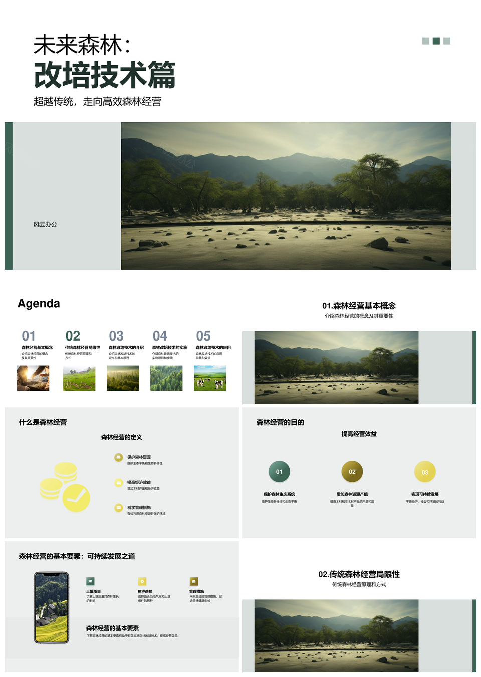 风云办公提供的森林改培技术提升经营效益PPT模板,下载格式为pptx,一共23页,作品中文字及图均可以修改和编辑,图片更改请在作品中右键图片并更换,文字修改请直接点击文字进行修改。