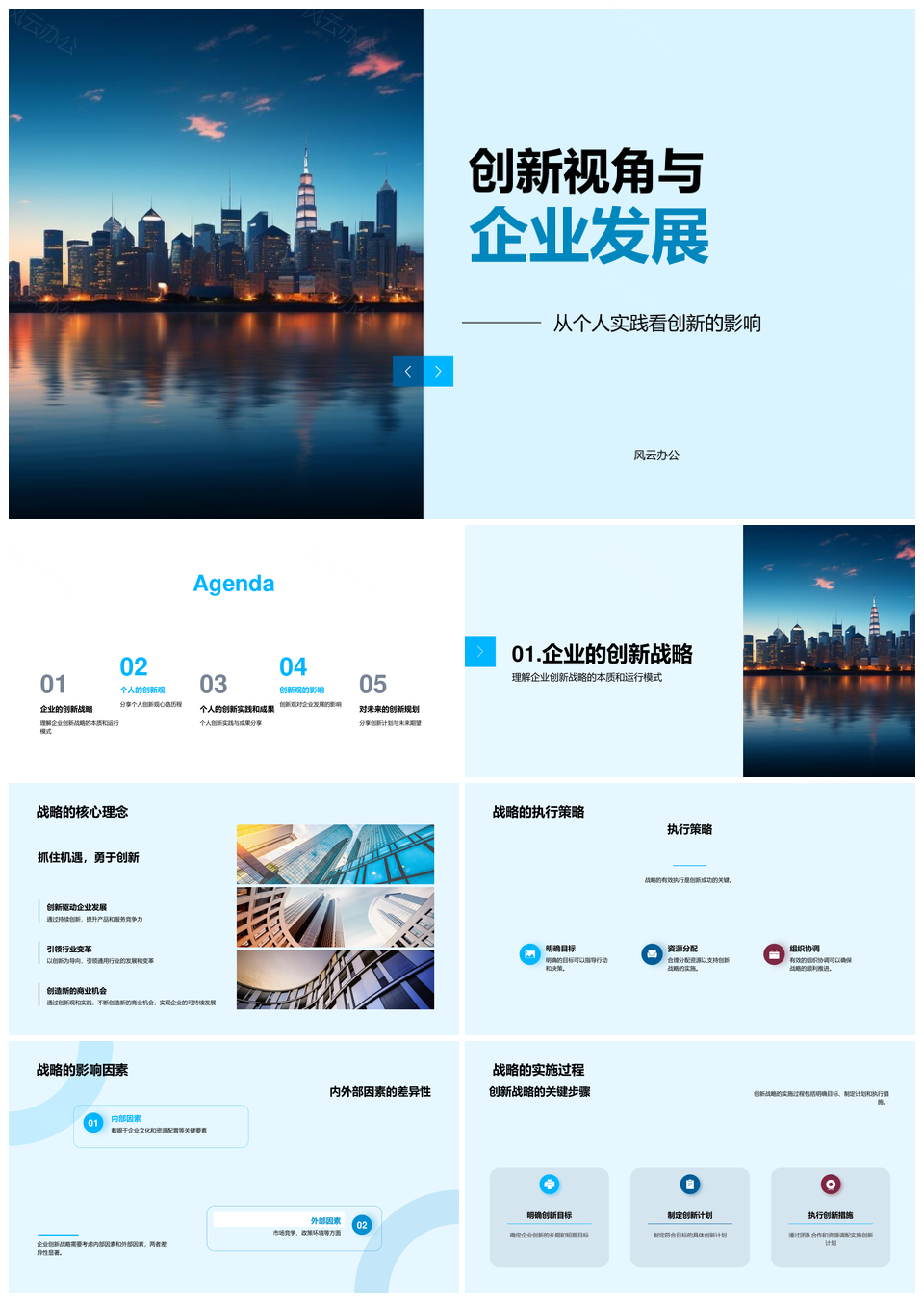 风云办公提供的创新视角驱动企业发展战略实践探索PPT模板,下载格式为pptx,一共33页,作品中文字及图均可以修改和编辑,图片更改请在作品中右键图片并更换,文字修改请直接点击文字进行修改。
