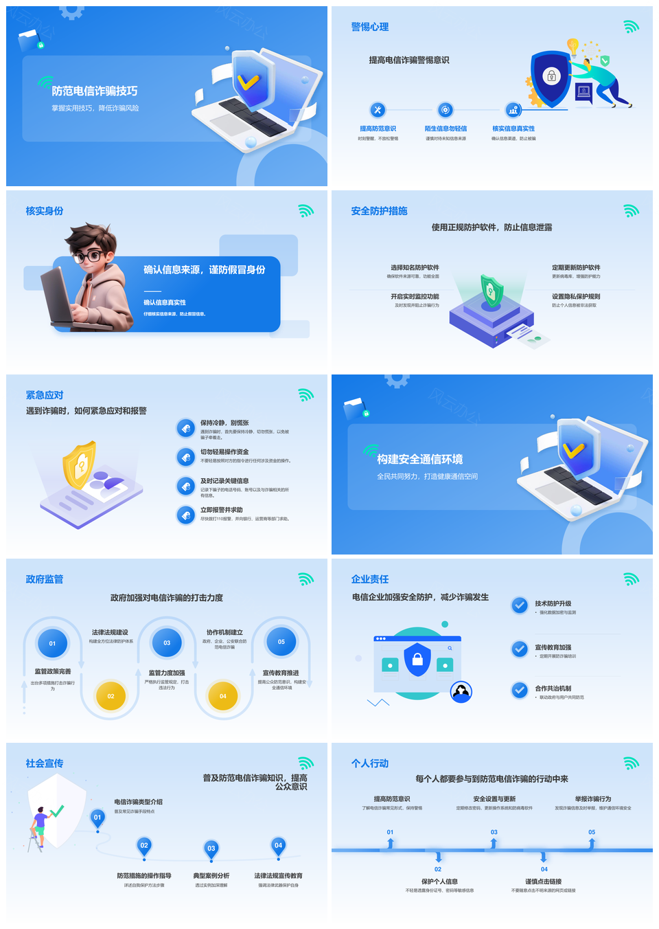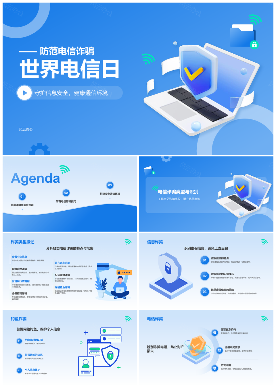 风云办公提供的世界电信日防范电信诈骗知识培训课件,下载格式为pptx,一共18页,作品中文字及图均可以修改和编辑,图片更改请在作品中右键图片并更换,文字修改请直接点击文字进行修改。
