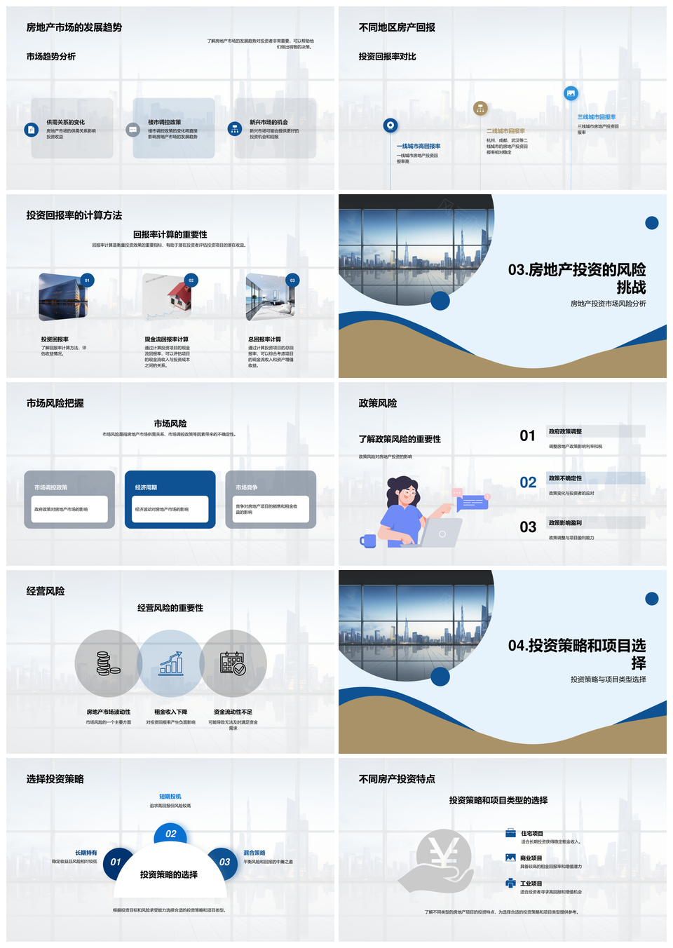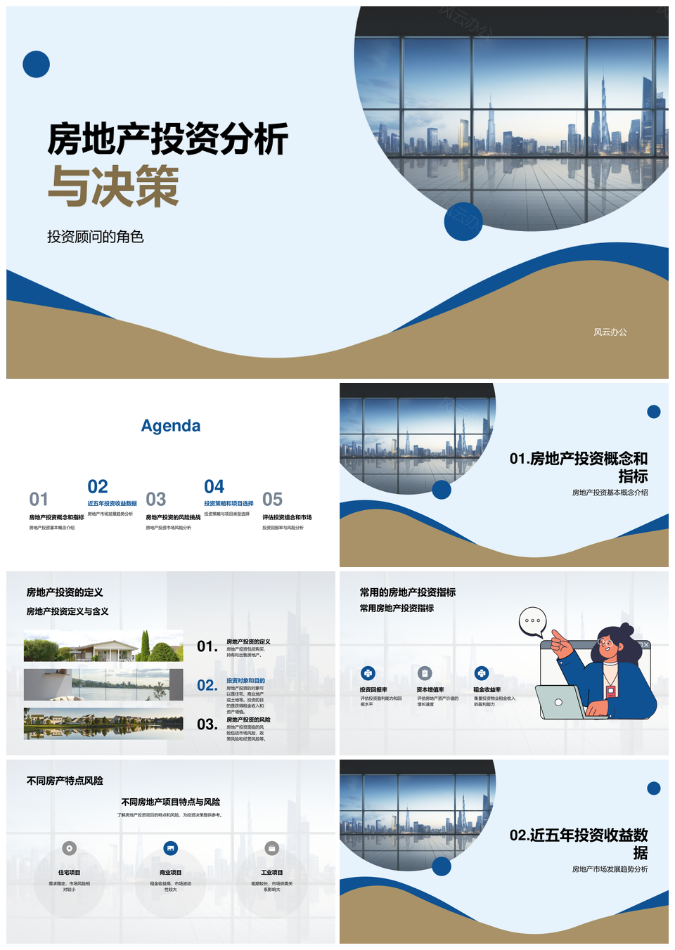 这是一张房地产投资顾问项目分析决策趋势风险回报指标PPT模板,包含房地产投资顾问、项目分析、决策、趋势、风险、回报、指标等主题内容,也可用作房地产投资顾问项目分析、投资顾问项目分析决策、顾问项目分析决策趋势、项目分析决策趋势风险、分析决策趋势风险回报、决策趋势风险回报指标、房地产投资顾问项目、投资顾问项目分析、顾问项目分析决策、项目分析决策趋势、分析决策趋势风险、决策趋势风险回报、趋势风险回报指标、房地产投资顾问、投资顾问项目等PPT场景使用。 风云办公提供的房地产投资顾问项目分析决策趋势风险回报指标PPT模板,下载格式为pptx,一共23页,作品中文字及图均可以修改和编辑,图片更改请在作品中右键图片并更换,文字修改请直接点击文字进行修改。