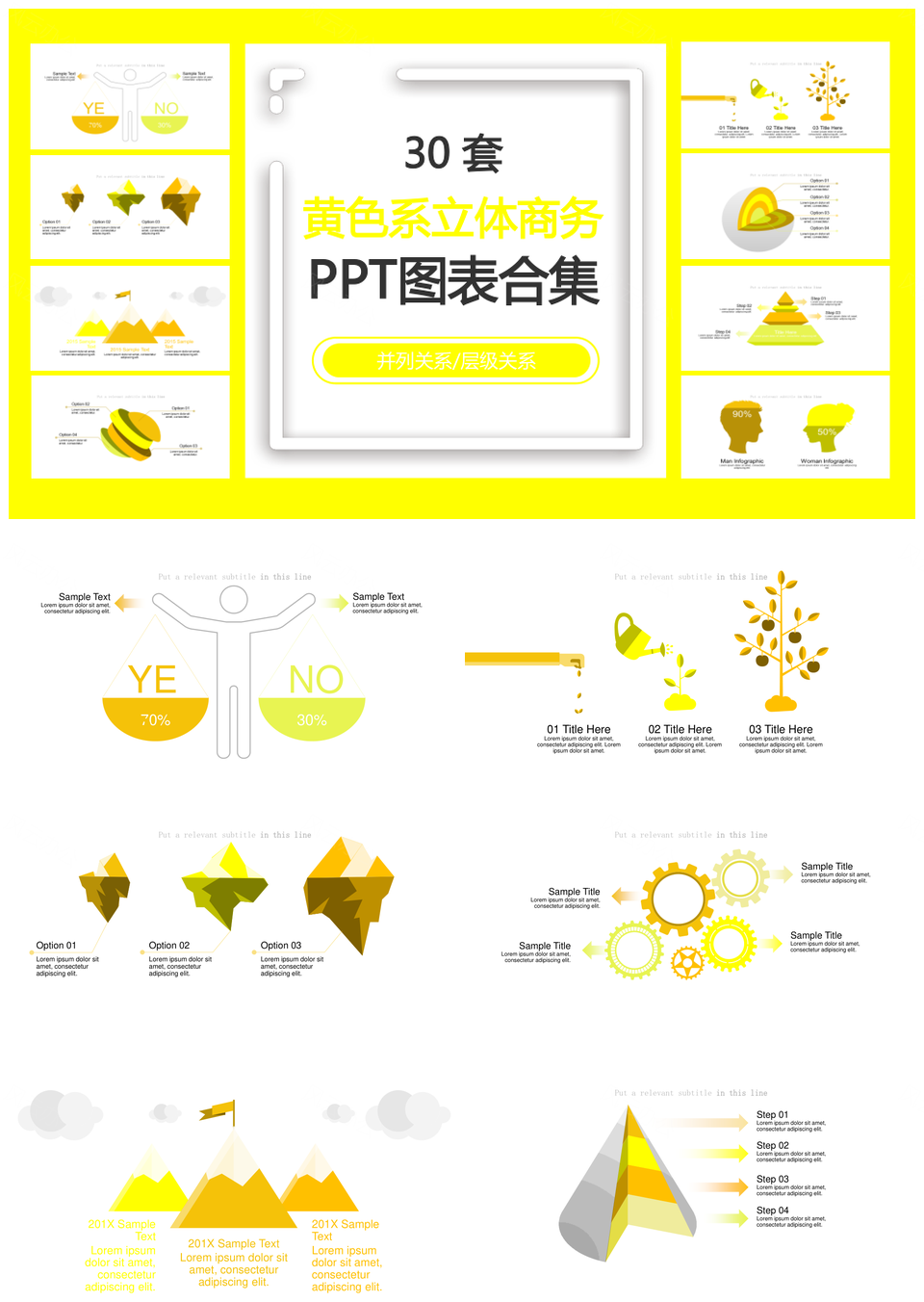 这是一张黄色系立体商务并列关系层级关系PPT图表合集,包含黄色系、立体、商务、并列关系、层级关系、图表、合集等主题内容,也可用作黄色系、立体、商务、并列关系、层级关系、PPT、图表、合集