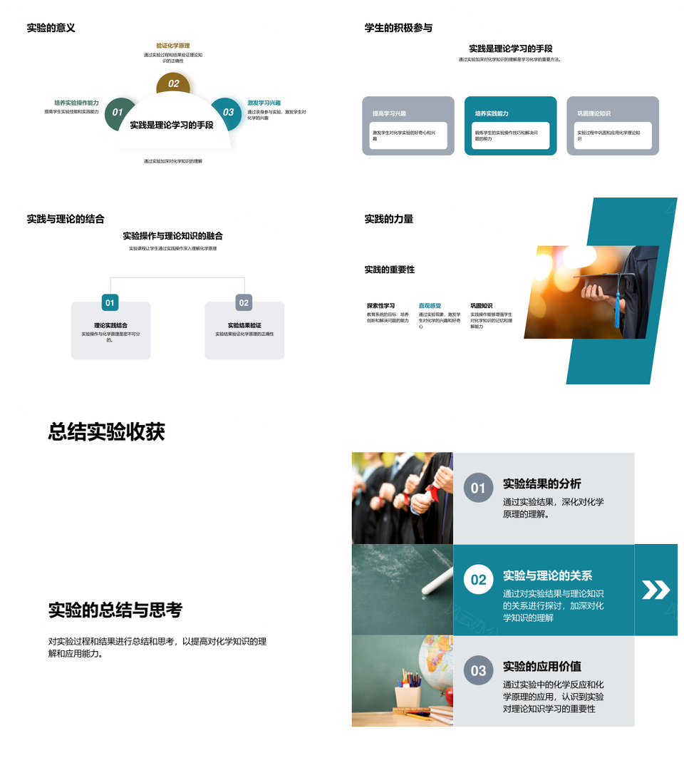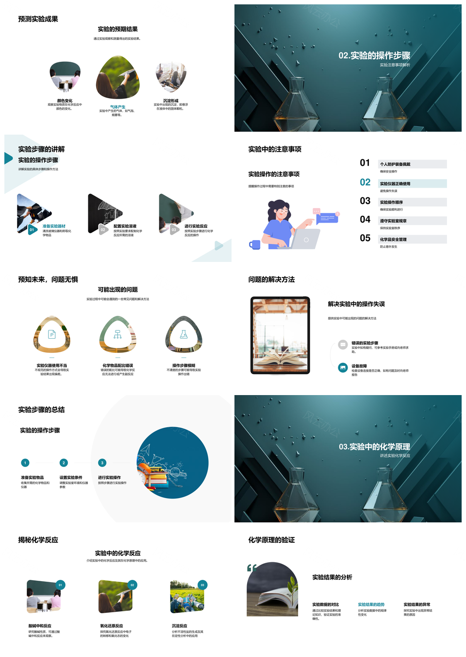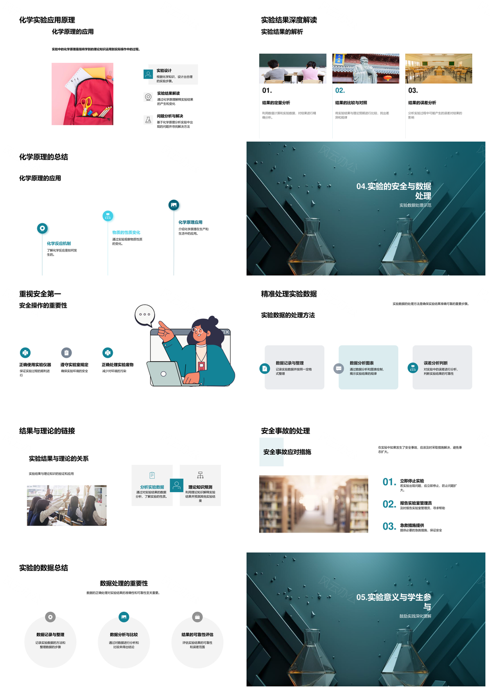 本模板以化学实验与量子物理为设计主线,采用灰蓝、白色为主色,融入粒子波动与激光线条等抽象图形,兼顾学术严谨与视觉清爽感。内置实验室器材图标、分子结构示意图及数据可视化排版,可快速适配实验报告、科研成果汇报等场景。模块化框架支持技术原理分解与逻辑推导展示,分章节导航页帮助梳理复杂研究路径,素材库包含激光衍射示意图、波函数曲线等专业素材,适用于高校教学、光电科技企业等需要展现技术深度与理论体系的工作场景。