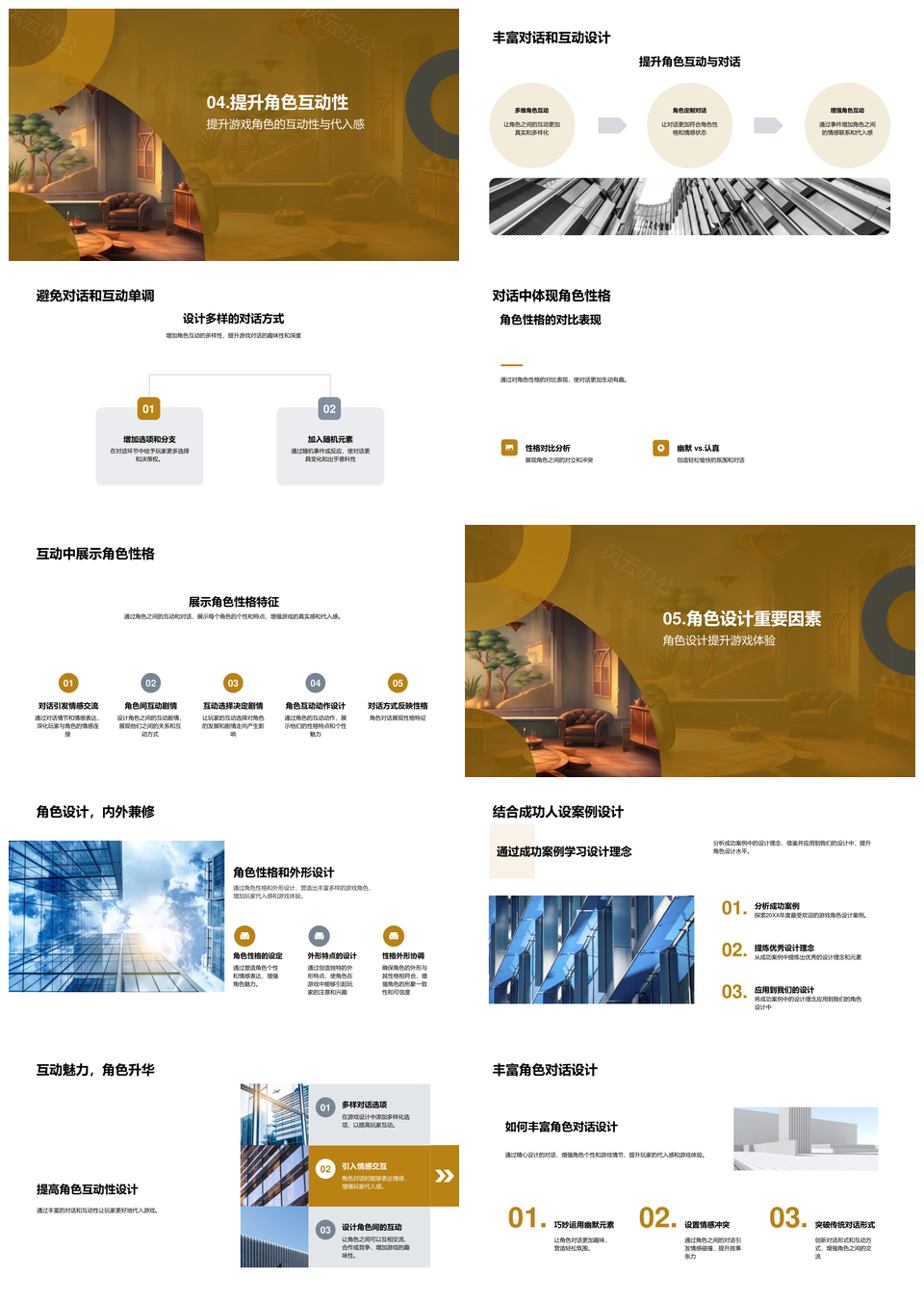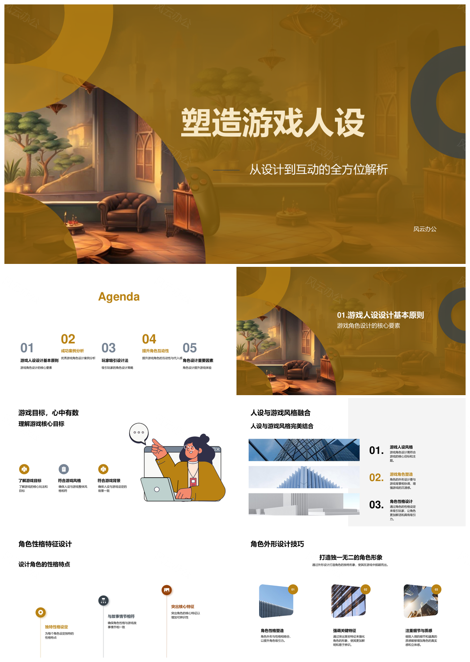 这是一张游戏角色设计互动解析性格外形核心目标PPT模板,包含游戏、角色、设计、互动、解析、性格、外形、核心、目标等主题内容,也可用作游戏角色设计互动解析、角色设计互动解析性格、设计互动解析性格外形、互动解析性格外形核心、解析性格外形核心目标、游戏角色设计互动、角色设计互动解析、设计互动解析性格、互动解析性格外形、解析性格外形核心、性格外形核心目标、游戏角色设计、角色设计互动、设计互动解析、互动解析性格等PPT场景使用。 风云办公提供的游戏角色设计互动解析性格外形核心目标PPT模板,下载格式为pptx,一共28页,作品中文字及图均可以修改和编辑,图片更改请在作品中右键图片并更换,文字修改请直接点击文字进行修改。