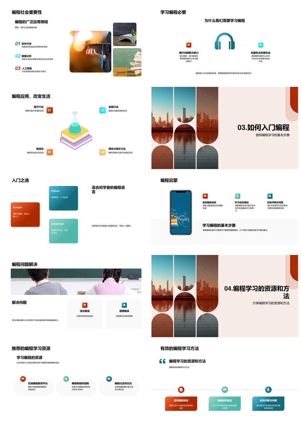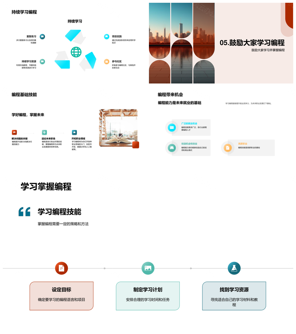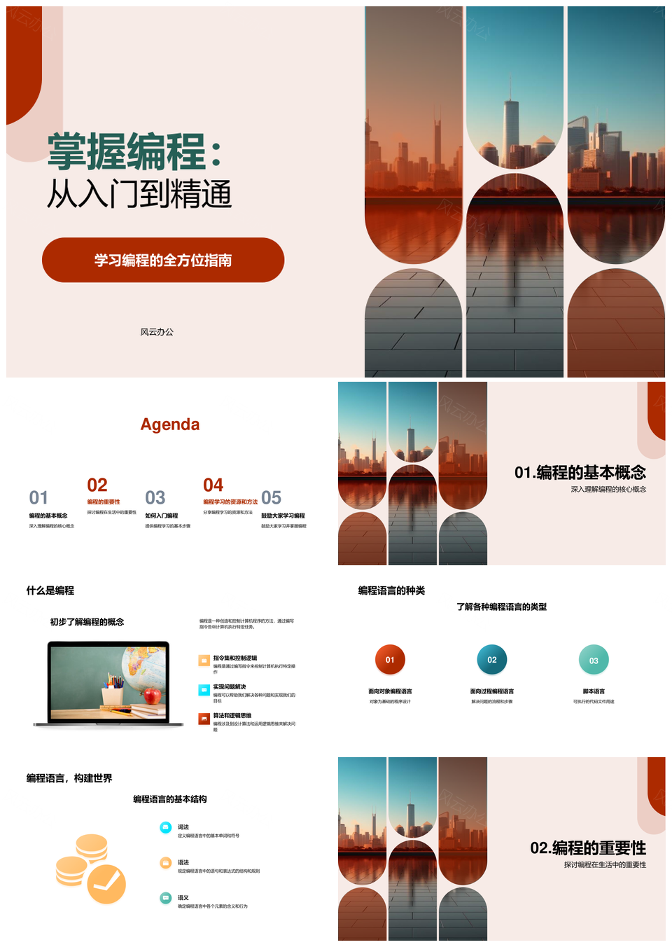 风云办公提供的编程从入门到精通语言学习资源应用PPT模板,下载格式为pptx,一共23页,作品中文字及图均可以修改和编辑,图片更改请在作品中右键图片并更换,文字修改请直接点击文字进行修改。