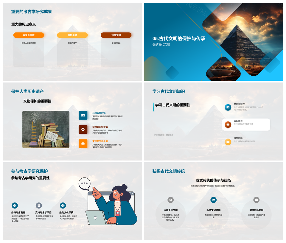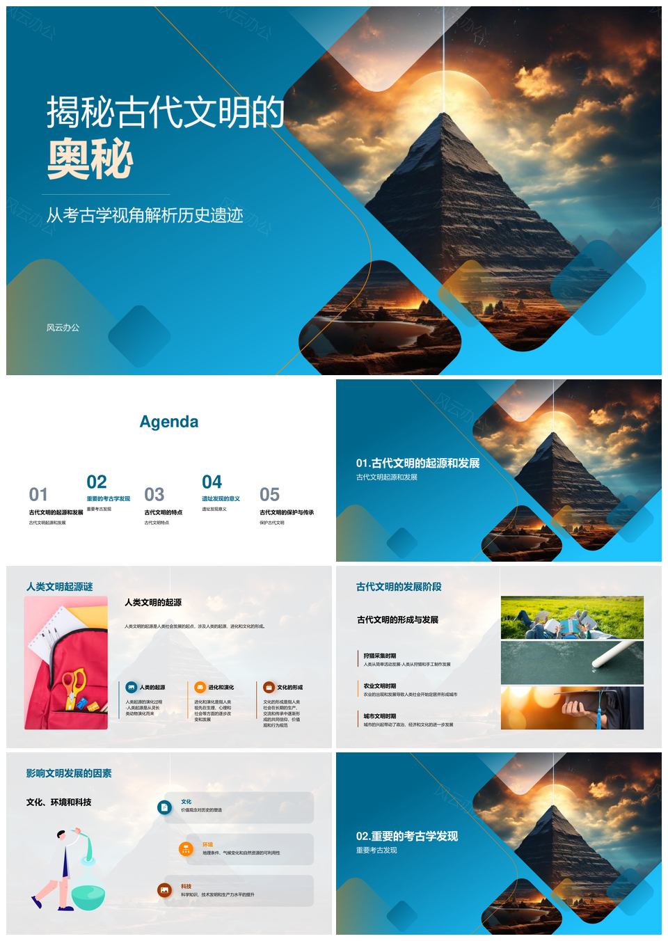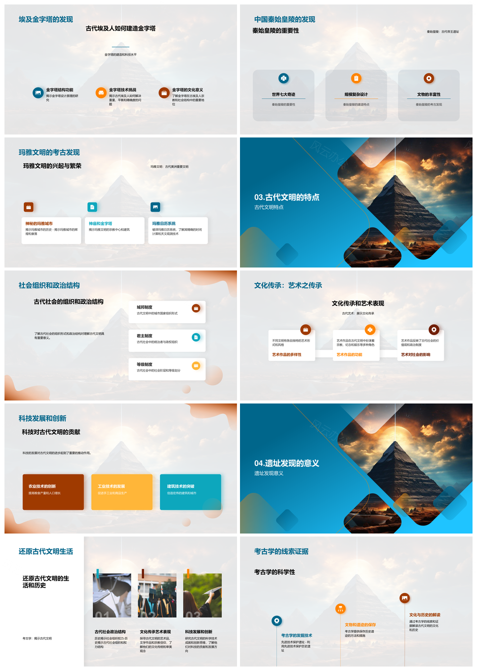 风云办公提供的考古学家专科课程探文明起源金字塔PPT模板,下载格式为pptx,一共24页,作品中文字及图均可以修改和编辑,图片更改请在作品中右键图片并更换,文字修改请直接点击文字进行修改。