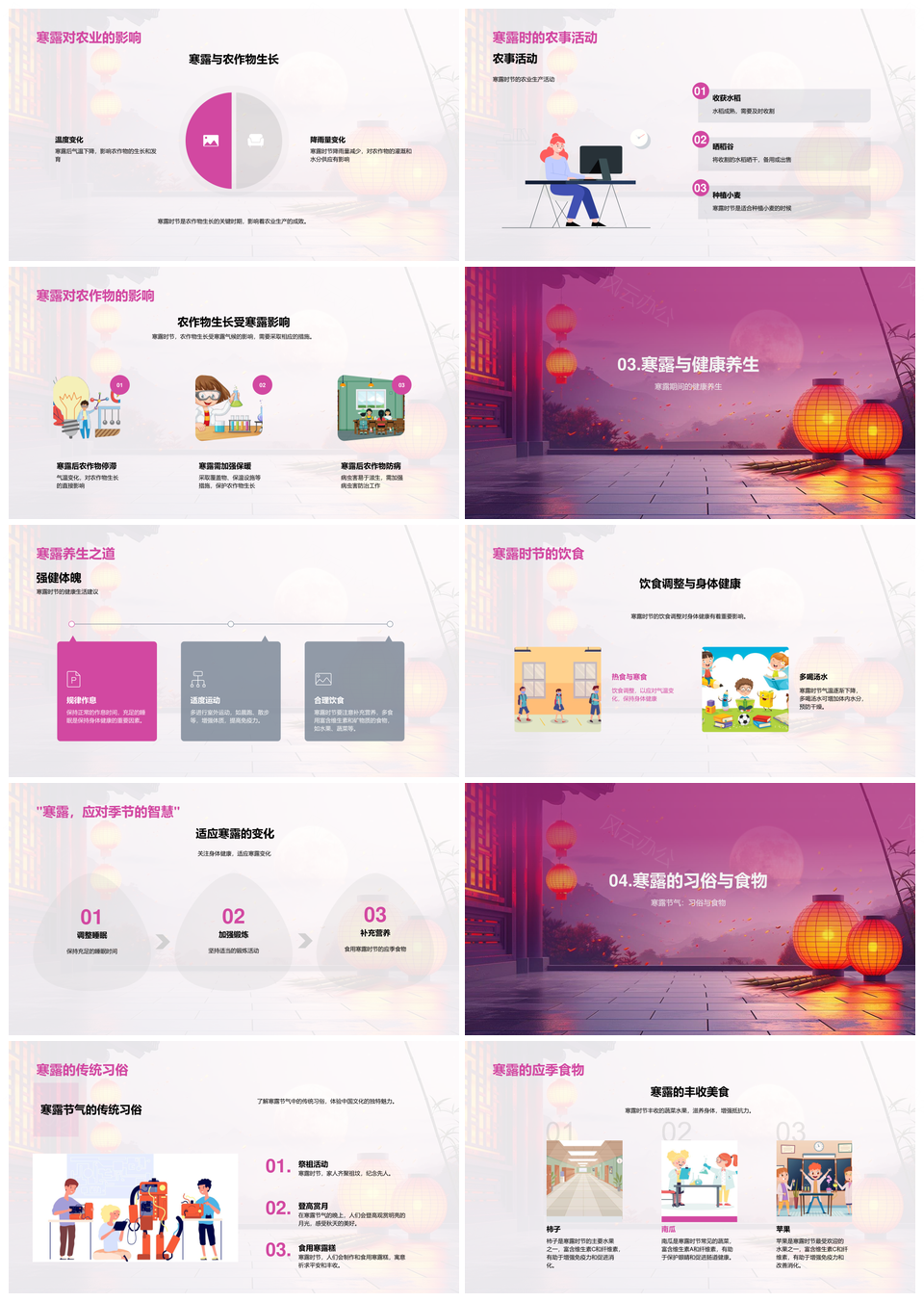 这是一张寒露农事养生作物饮食习俗生产指导PPT模板,包含寒露、农事、养生、作物、饮食、习俗、生产指导等主题内容,也可用作寒露农事生产指导、农事养生作物饮食、养生作物饮食习俗、作物饮食习俗生产、饮食习俗生产指导、寒露农事养生作物、农事养生作物饮食习俗、寒露养生作物饮食、养生作物饮食生产、农事作物饮食习俗、寒露农事养生饮食、作物生产饮食习俗、寒露养生饮食习俗、农事生产饮食习俗、养生作物生产指导等PPT场景使用。