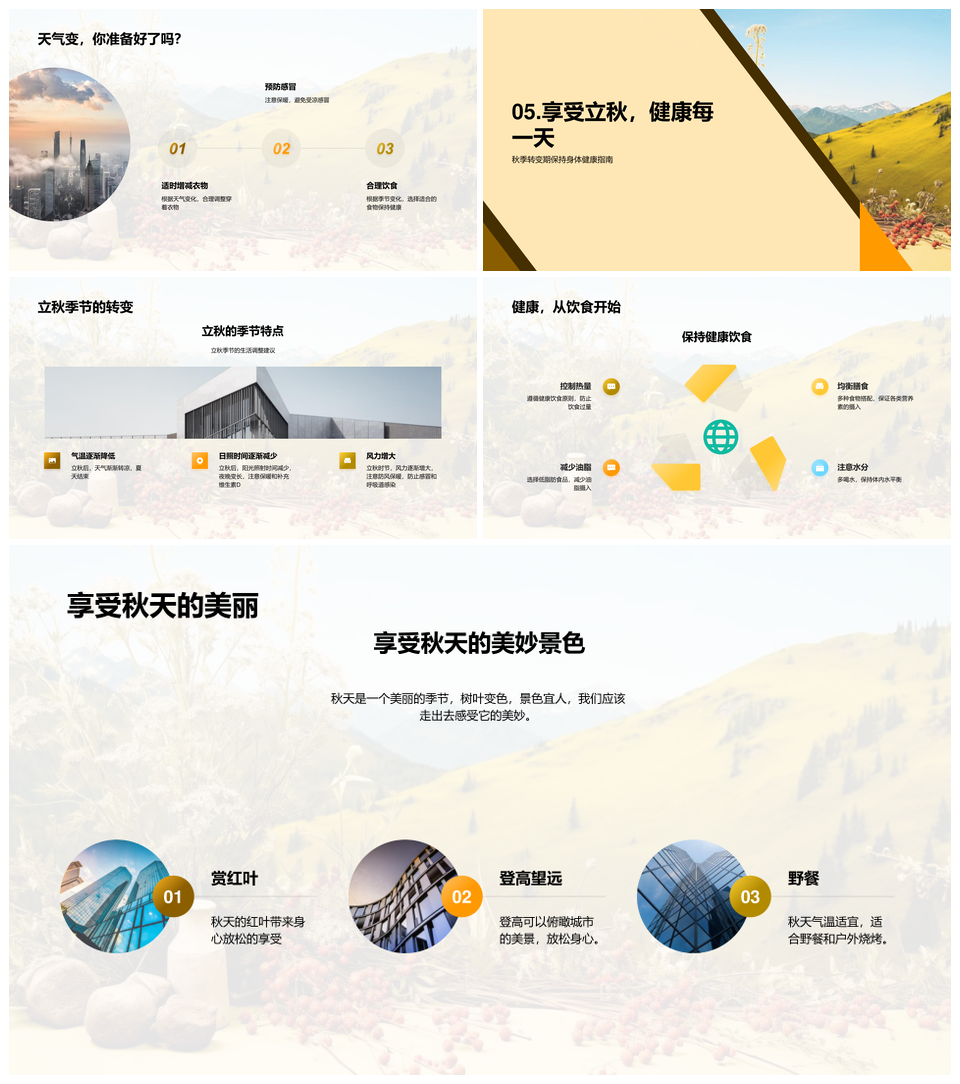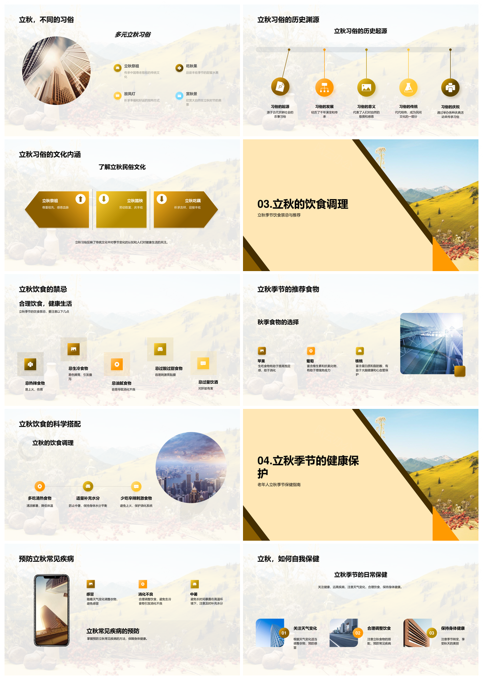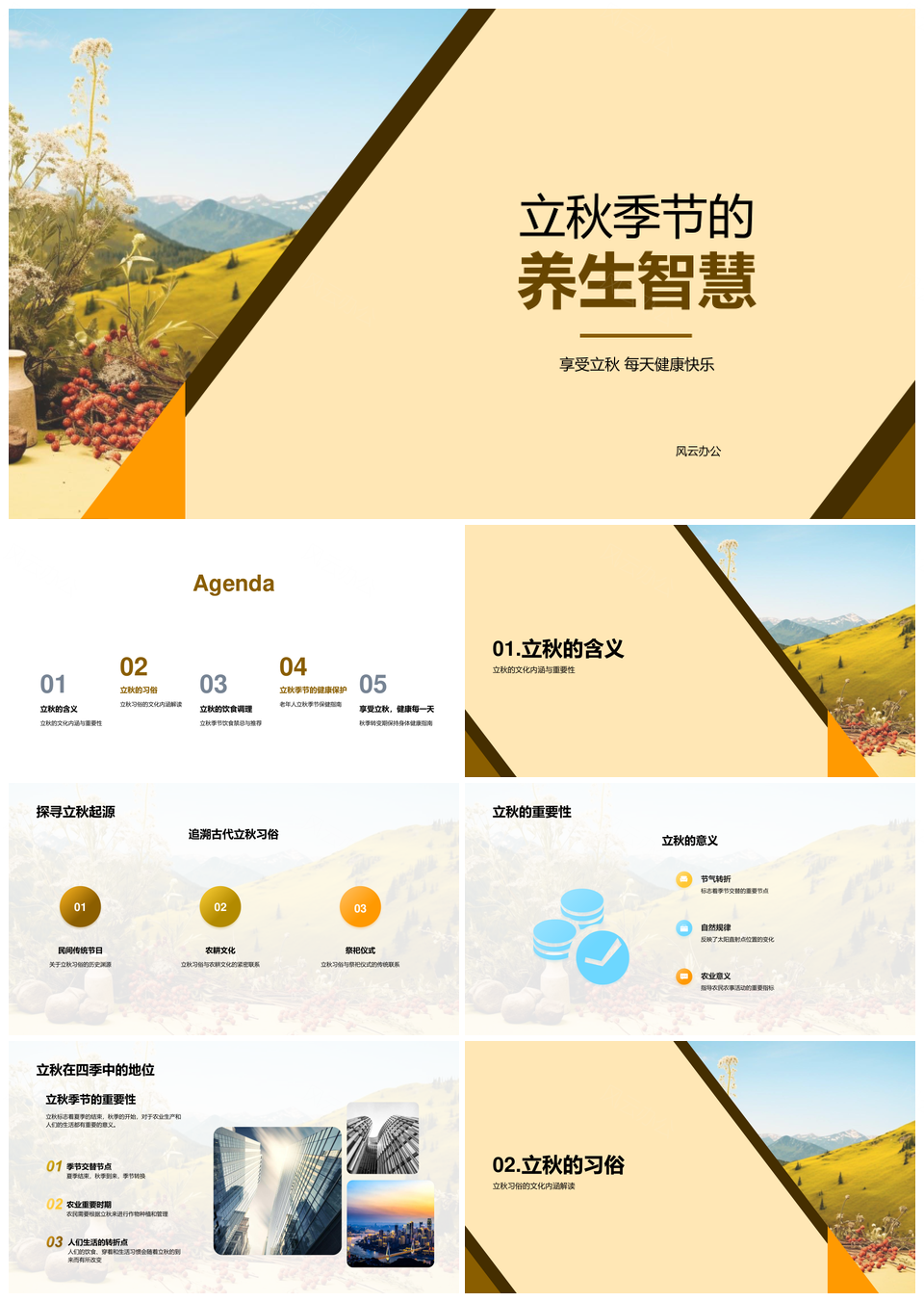 风云办公提供的立秋起源习俗养生智慧与饮食禁忌PPT模板,下载格式为pptx,一共23页,作品中文字及图均可以修改和编辑,图片更改请在作品中右键图片并更换,文字修改请直接点击文字进行修改。