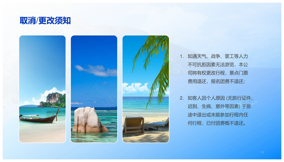 这是一张2025蓝色现代商务海滨旅游度假宣传商业计划PPT模板,包含2025、蓝色、现代、商务、海滨、旅游、度假、宣传、商业计划等主题内容,也可用作2025蓝色现代商务海滨、蓝色现代商务海滨旅游、现代商务海滨旅游度假、商务海滨旅游度假宣传、海滨旅游度假宣传商业、旅游度假宣传商业计划、蓝色现代商务海滨、现代商务海滨旅游、商务海滨旅游度假、海滨旅游度假宣传、旅游度假宣传商业、蓝色现代商务、现代商务海滨、商务海滨旅游、海滨旅游度假等PPT场景使用。 风云办公提供的2025蓝色现代商务海滨旅游度假宣传商业计划PPT模板,下载格式为pptx,一共19页,作品中文字及图均可以修改和编辑,图片更改请在作品中右键图片并更换,文字修改请直接点击文字进行修改。