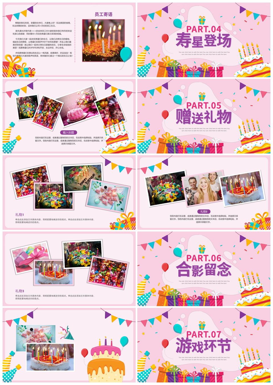 风云办公提供的粉色卡通员工生日会快乐祝福PPT模板,下载格式为pptx,一共23页,作品中文字及图均可以修改和编辑,图片更改请在作品中右键图片并更换,文字修改请直接点击文字进行修改。