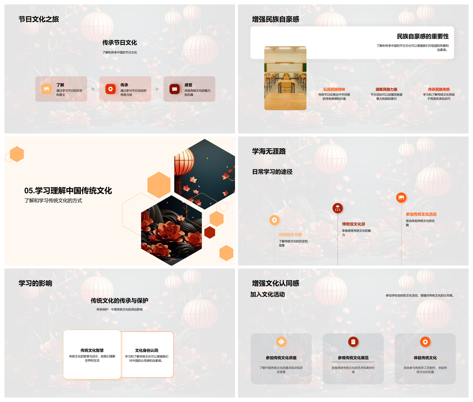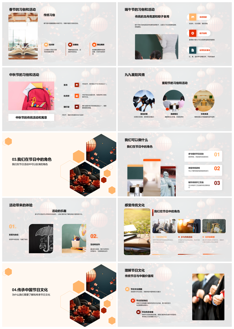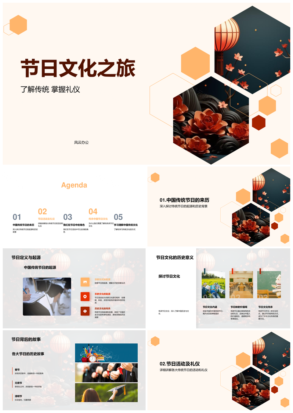 这是一张中国传统节日春节端午中秋重阳文化礼仪灯笼活动PPT模板,包含传统节日、春节、端午、中秋、重阳、文化、礼仪、灯笼、活动等主题内容,也可用作中国传统节日春节端午中秋、春节端午中秋重阳文化、传统节日春节端午中秋、节日春节端午中秋重阳、端午中秋重阳文化活动、春节文化礼仪灯笼活动、传统节日文化礼仪活动、中秋重阳文化礼仪灯笼、重阳文化礼仪灯笼活动、中国传统节日文化活动、端午中秋重阳灯笼活动、传统节日礼仪灯笼活动、春节端午中秋重阳文化、中秋文化礼仪灯笼活动、端午中秋文化礼仪活动等PPT场景使用。 风云办公提供的中国传统节日春节端午中秋重阳文化礼仪灯笼活动PPT模板,下载格式为pptx,一共24页,作品中文字及图均可以修改和编辑,图片更改请在作品中右键图片并更换,文字修改请直接点击文字进行修改。