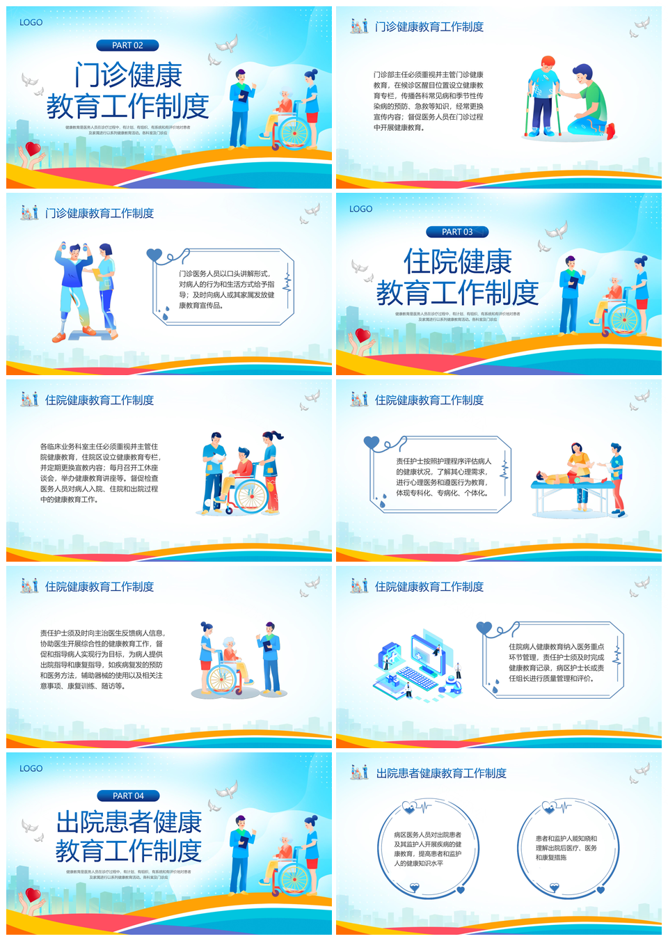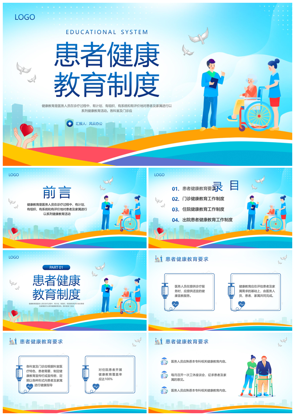 风云办公提供的蓝色卡通患者健康教育护理动态PPT模板宣传,下载格式为pptx,一共20页,作品中文字及图均可以修改和编辑,图片更改请在作品中右键图片并更换,文字修改请直接点击文字进行修改。