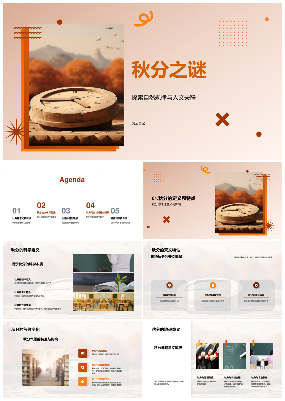 风云办公提供的秋分天文人文气候文史地理秋叶律动PPT模板,下载格式为pptx,一共33页,作品中文字及图均可以修改和编辑,图片更改请在作品中右键图片并更换,文字修改请直接点击文字进行修改。