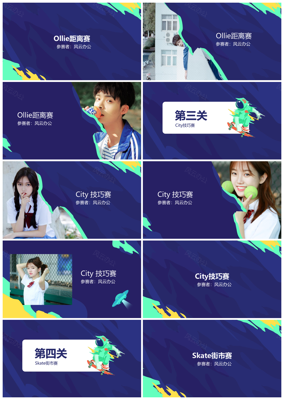 风云办公提供的炫酷滑板比赛活动策划简约视觉设计模板,下载格式为pptx,一共18页,作品中文字及图均可以修改和编辑,图片更改请在作品中右键图片并更换,文字修改请直接点击文字进行修改。