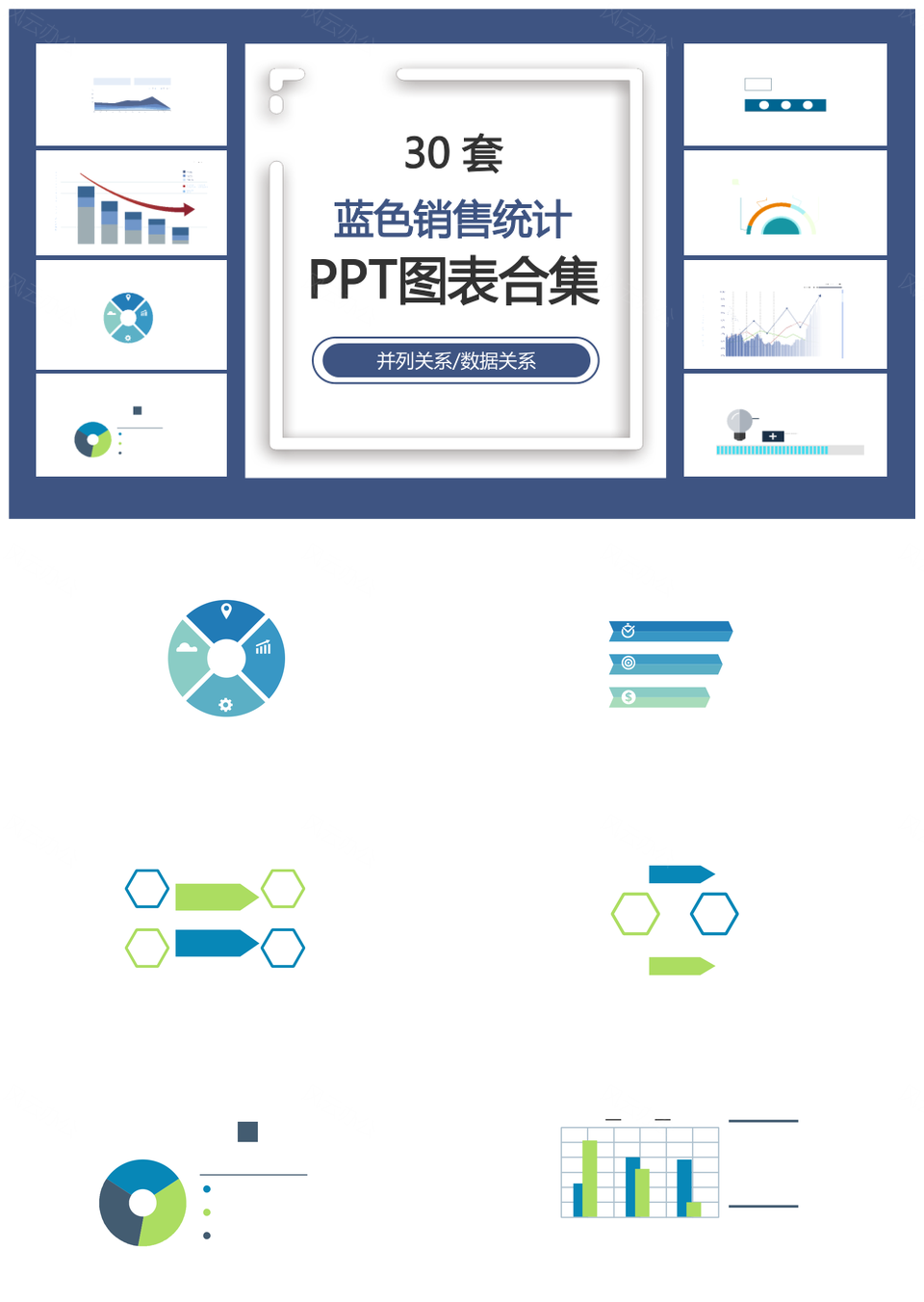 这是一张蓝色销售统计并列关系数据关系PPT图表合集,包含蓝色、销售统计、并列关系、数据关系、图表合集等主题内容,也可用作蓝色、销售、统计、并列关系、数据关系、PPT图表、合集