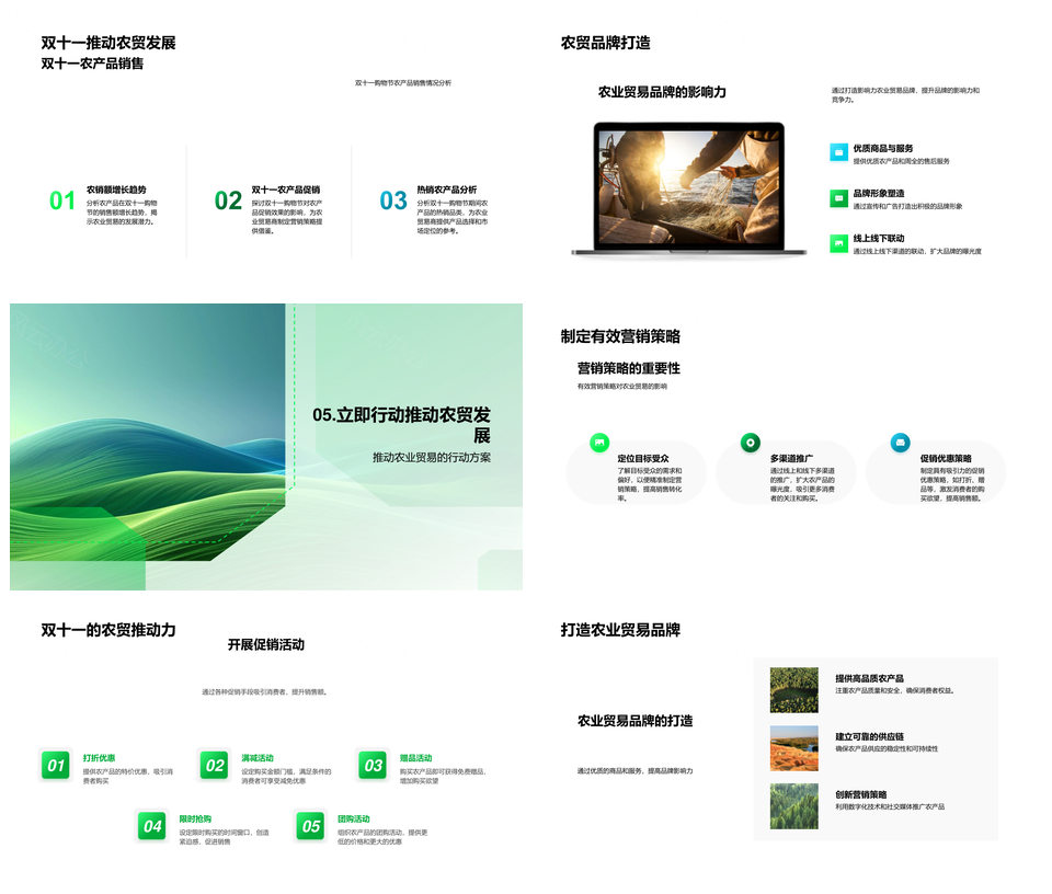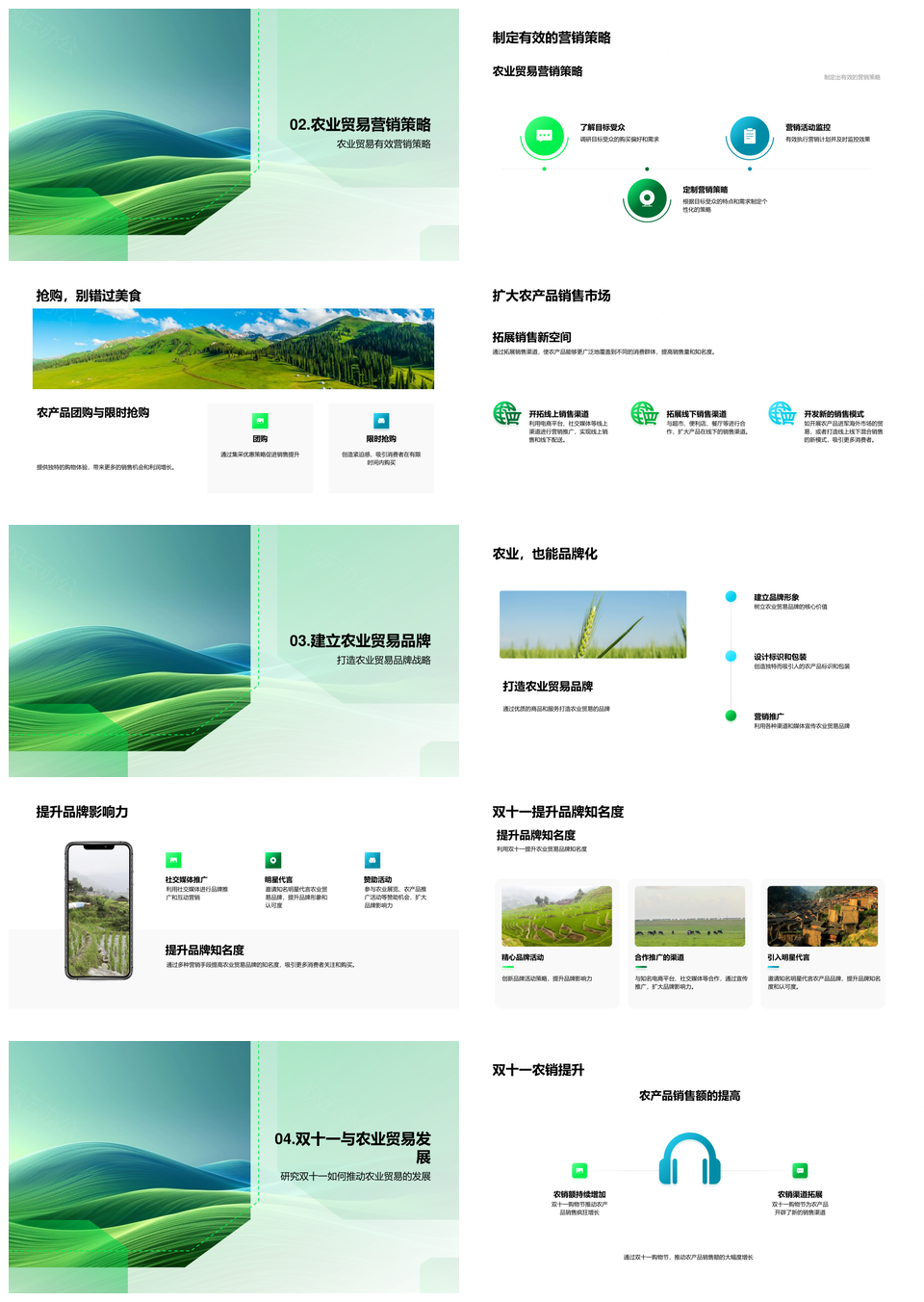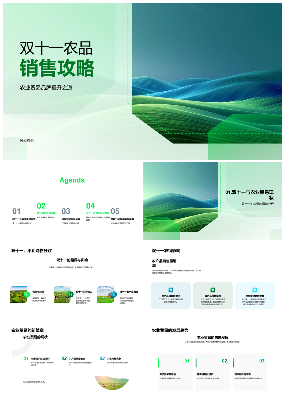 风云办公提供的双十一农业品牌营销限时团购销售攻略PPT模板,下载格式为pptx,一共24页,作品中文字及图均可以修改和编辑,图片更改请在作品中右键图片并更换,文字修改请直接点击文字进行修改。