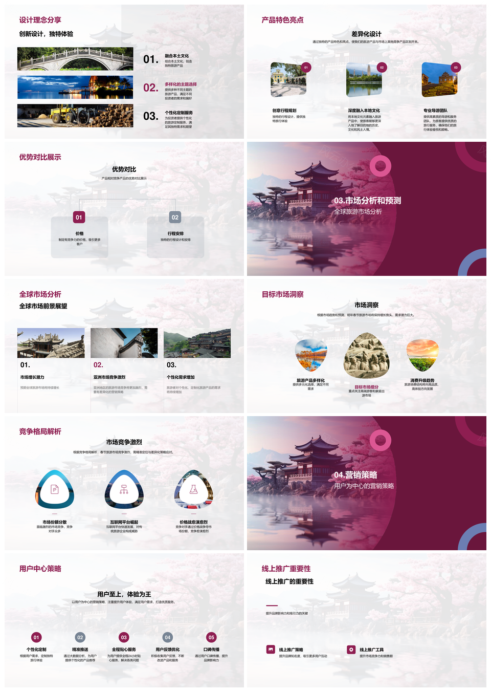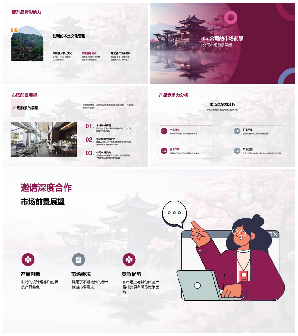 风云办公提供的新春樱花旅游产品优势全球引资营销PPT模板,下载格式为pptx,一共23页,作品中文字及图均可以修改和编辑,图片更改请在作品中右键图片并更换,文字修改请直接点击文字进行修改。
