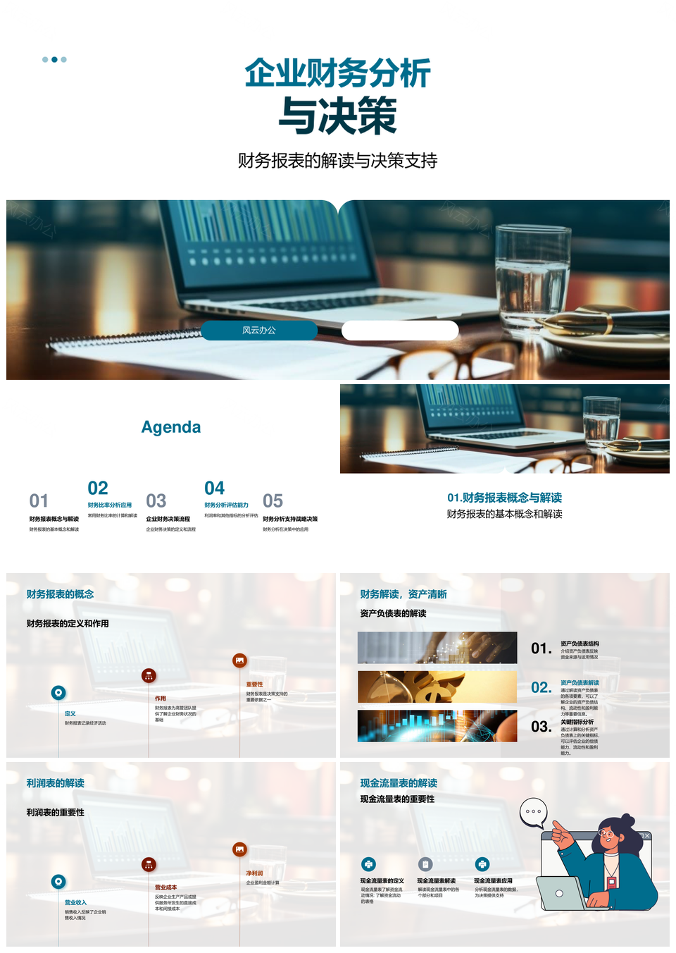 风云办公提供的企业财务分析决策支持报表指标解读PPT模板,下载格式为pptx,一共29页,作品中文字及图均可以修改和编辑,图片更改请在作品中右键图片并更换,文字修改请直接点击文字进行修改。