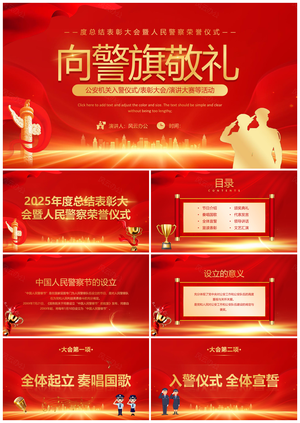 这是一张2024中国人民警察节警旗敬礼红色简约表彰典礼PPT模板,包含2024、中国人民警察节、警旗、敬礼、红色、简约、表彰典礼等主题内容,也可用作2024中国人民警察节警旗敬礼、中国人民警察节警旗敬礼红色、警察节警旗敬礼红色简约、警旗敬礼红色简约表彰、红色简约表彰典礼、2024中国警旗敬礼红色、中国人民警察节警旗、警察节警旗红色简约、警旗敬礼红色表彰、红色简约表彰典礼、中国警察节警旗敬礼、人民警察节警旗、警旗红色简约表彰、简约表彰典礼、警旗敬礼红色等PPT场景使用。 风云办公提供的2024中国人民警察节警旗敬礼红色简约表彰典礼PPT模板,下载格式为pptx,一共14页,作品中文字及图均可以修改和编辑,图片更改请在作品中右键图片并更换,文字修改请直接点击文字进行修改。