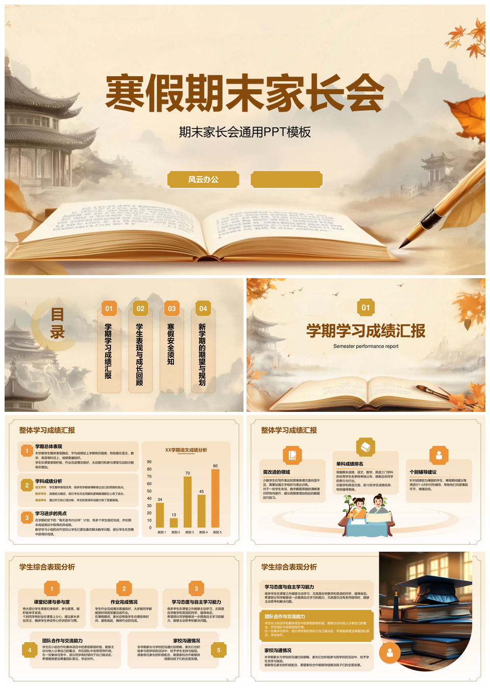 风云办公提供的黄色国风水墨书本毛笔寒假期末家长会PPT模板,下载格式为pptx,一共25页,作品中文字及图均可以修改和编辑,图片更改请在作品中右键图片并更换,文字修改请直接点击文字进行修改。