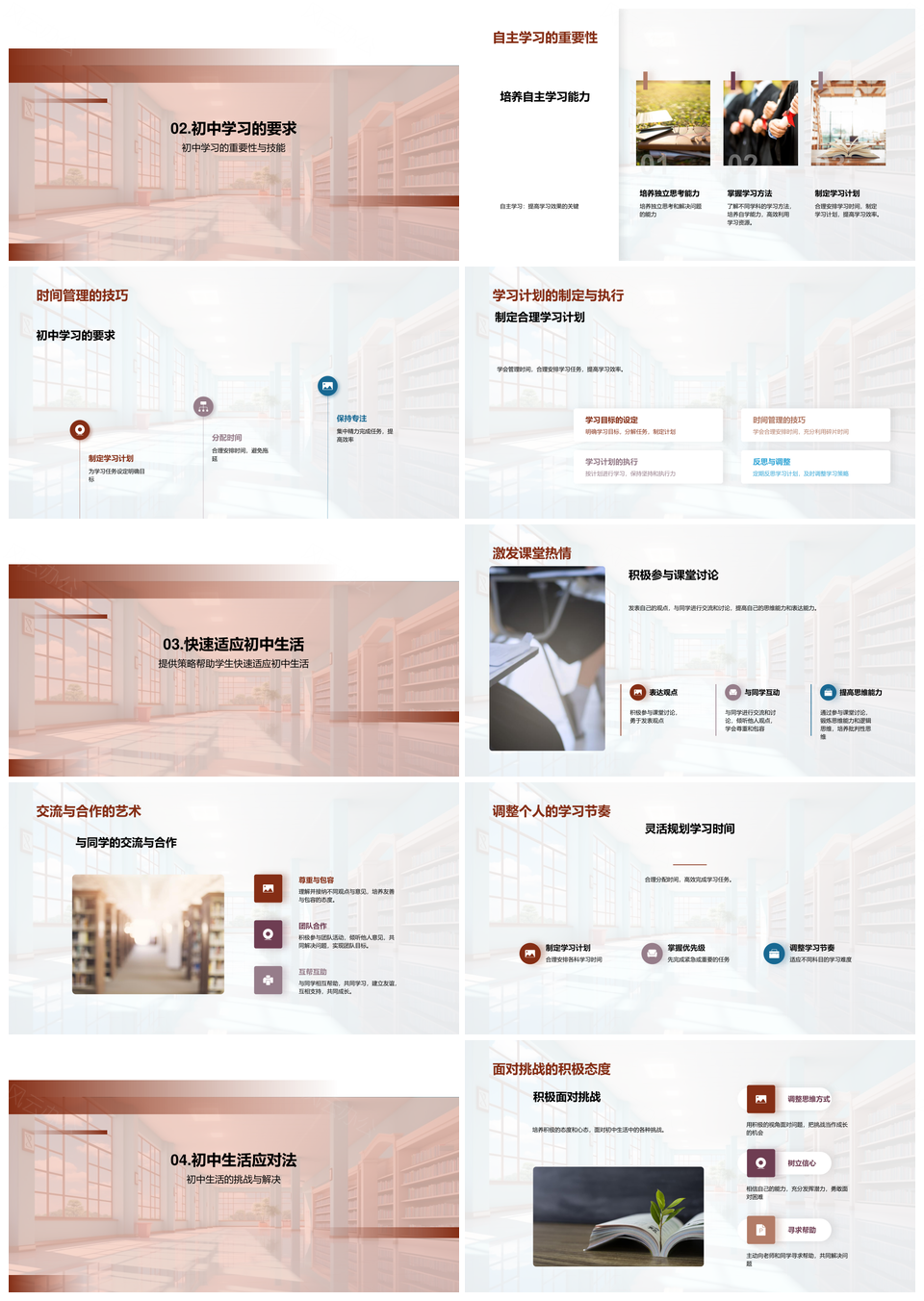 风云办公提供的初中新生适应规划学习人际自主全攻略PPT模板,下载格式为pptx,一共24页,作品中文字及图均可以修改和编辑,图片更改请在作品中右键图片并更换,文字修改请直接点击文字进行修改。