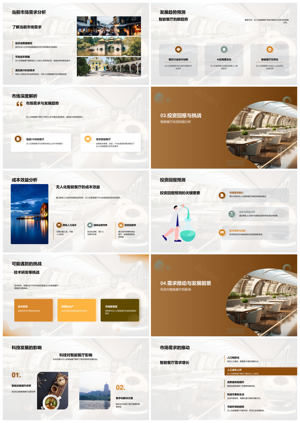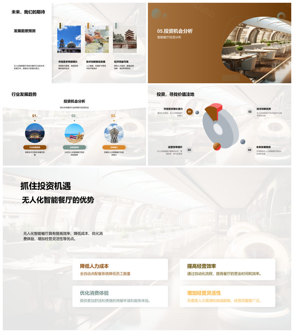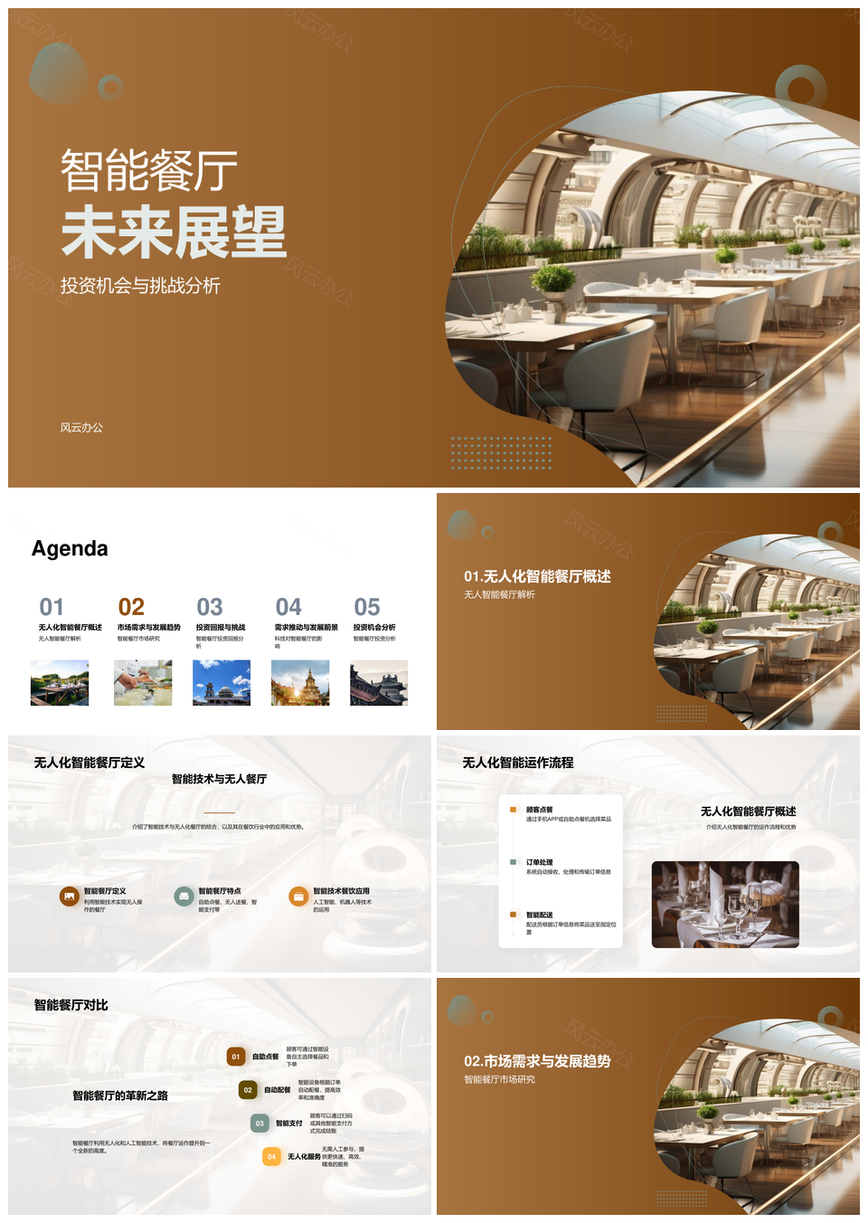 风云办公提供的智能餐厅无人化投资挑战与机器人前景PPT模板,下载格式为pptx,一共23页,作品中文字及图均可以修改和编辑,图片更改请在作品中右键图片并更换,文字修改请直接点击文字进行修改。