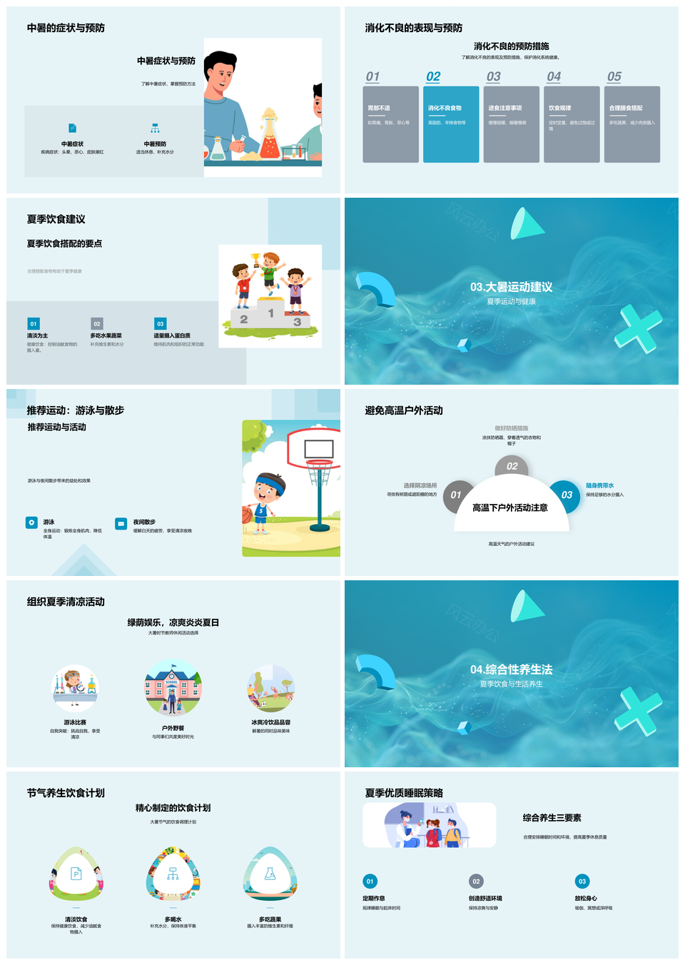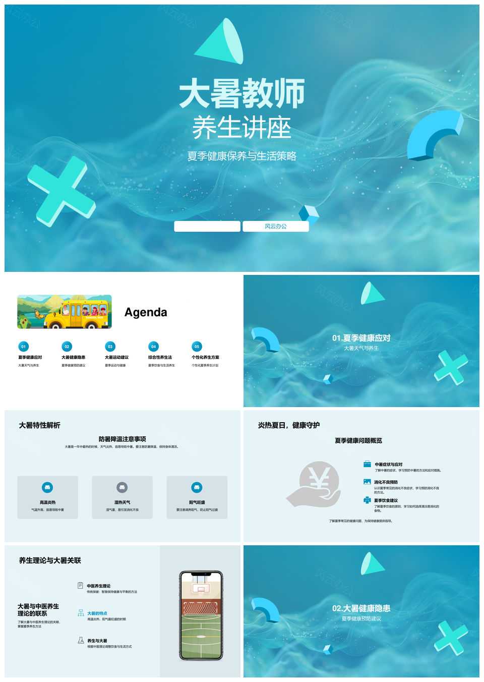 风云办公提供的大暑教师养生防暑饮食睡眠指南PPT模板,下载格式为pptx,一共23页,作品中文字及图均可以修改和编辑,图片更改请在作品中右键图片并更换,文字修改请直接点击文字进行修改。