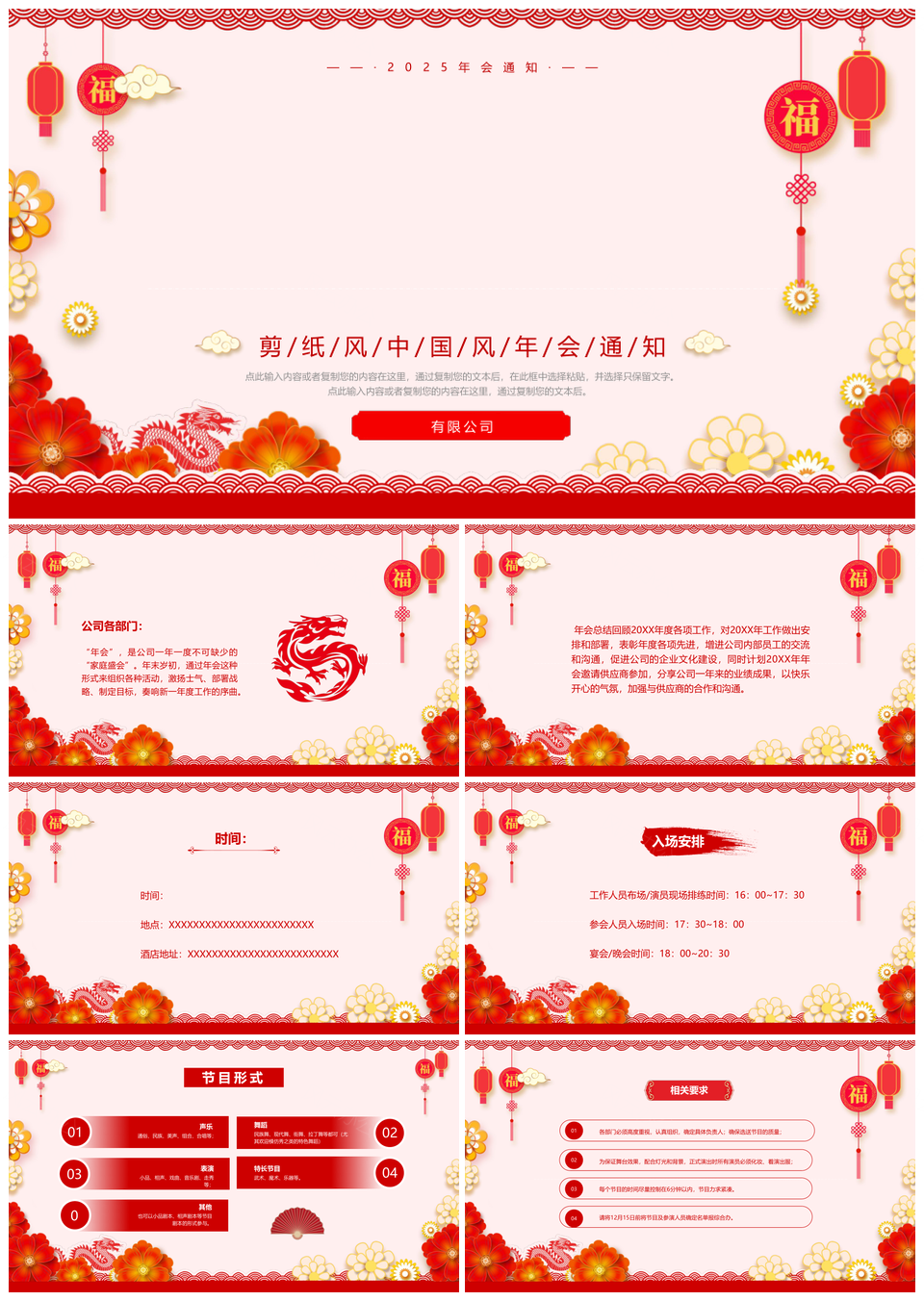 2024龙年红色剪纸风年会通知PPT模板推荐