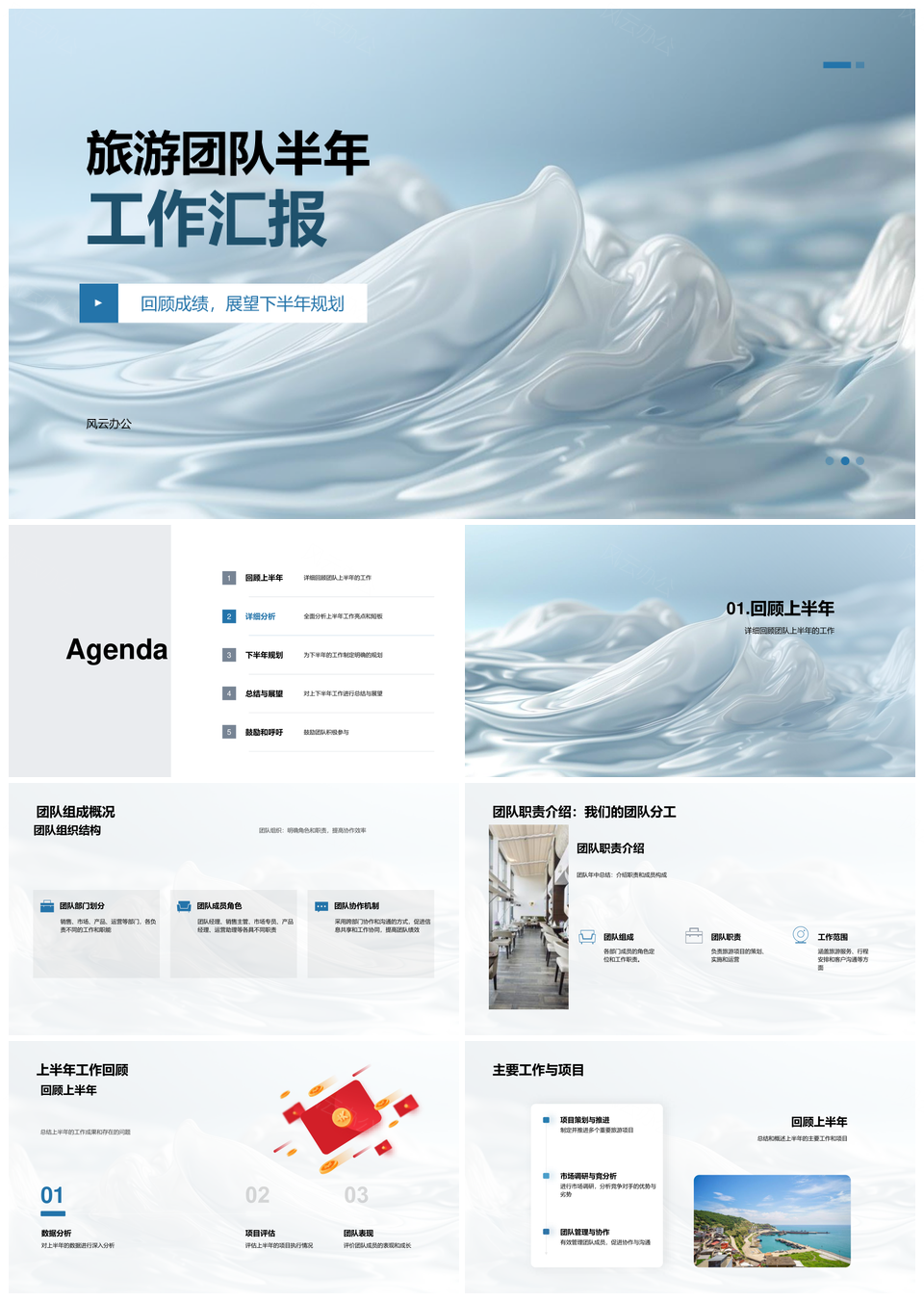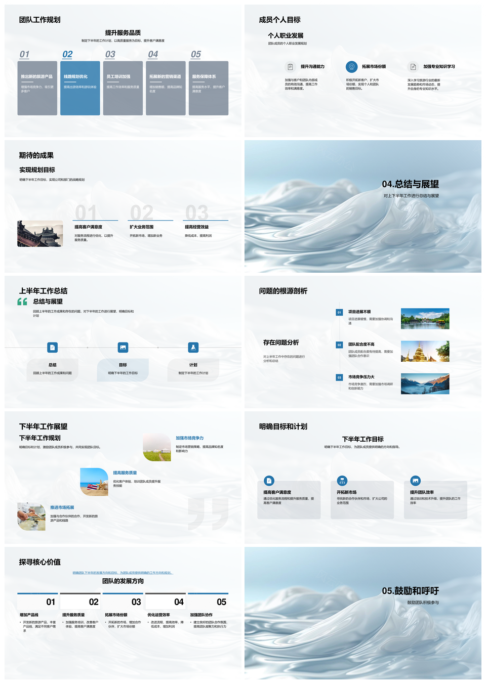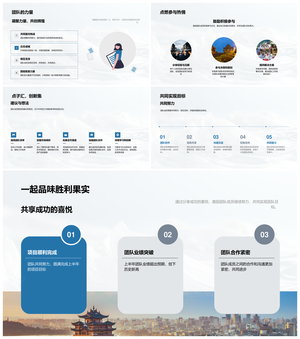 这是一张旅游团队半年工作总结目标规划职责亮点成员表现汇报PPT模板,包含旅游团队、半年、工作总结、目标、规划、职责、亮点、成员表现、汇报等主题内容,也可用作旅游团队半年工作总结目标规划、旅游团队半年工作目标规划、旅游团队半年工作总结、半年工作总结目标规划、工作总结目标规划职责、目标规划职责亮点成员、职责亮点成员表现汇报、目标规划职责亮点、旅游团队半年职责亮点、半年工作职责成员表现、工作总结亮点成员表现、职责亮点成员表现、半年工作总结亮点、目标规划职责亮点、旅游团队成员表现汇报等PPT场景使用。 风云办公提供的旅游团队半年工作总结目标规划职责亮点成员表现汇报PPT模板,下载格式为pptx,一共33页,作品中文字及图均可以修改和编辑,图片更改请在作品中右键图片并更换,文字修改请直接点击文字进行修改。
