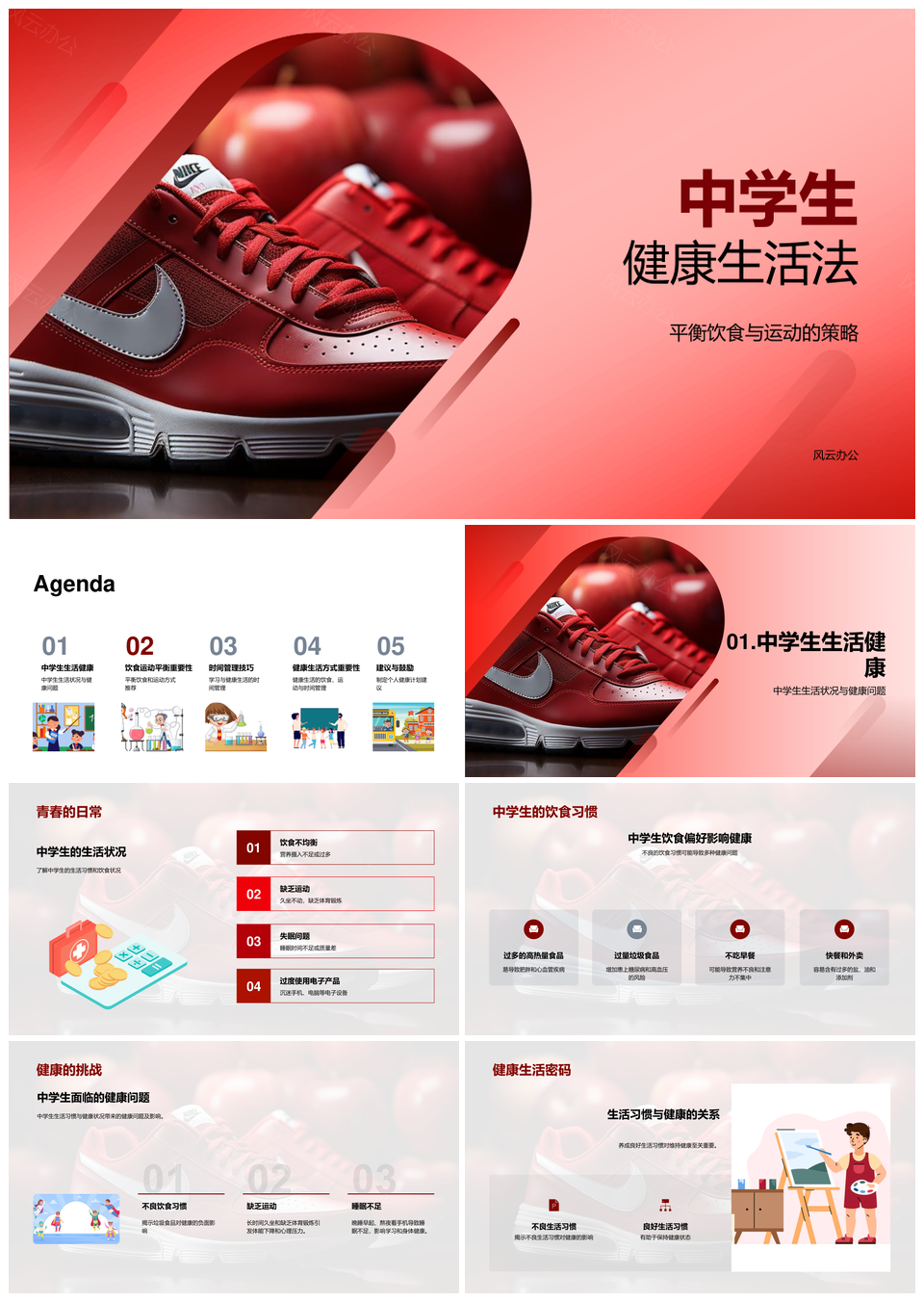 风云办公提供的中学生健康教育苹果健康生活法PPT模板,下载格式为pptx,一共33页,作品中文字及图均可以修改和编辑,图片更改请在作品中右键图片并更换,文字修改请直接点击文字进行修改。