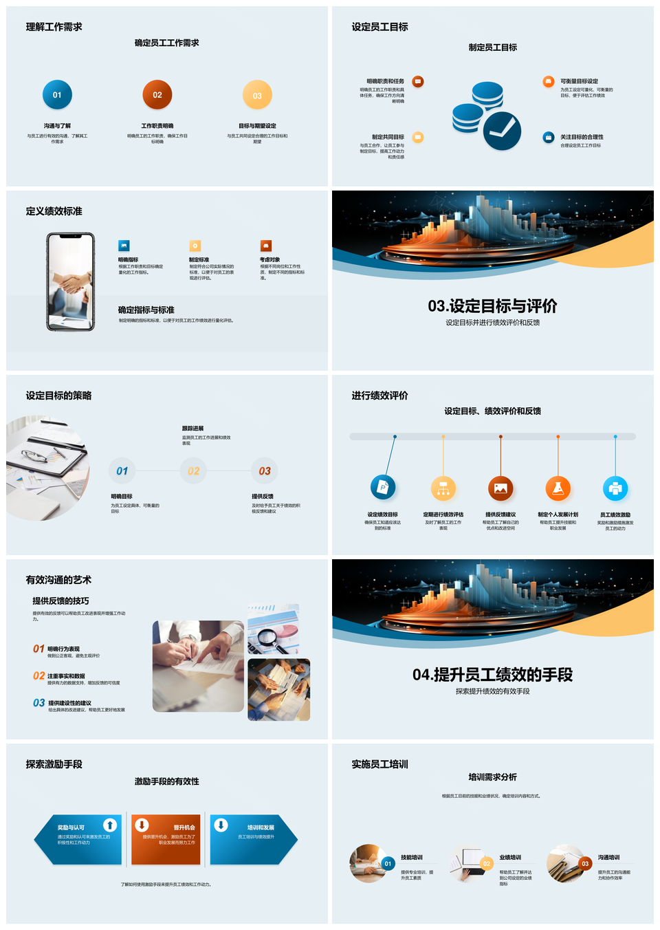 这是一张绩效管理员工绩效标准评价激励培训图表PPT模板,包含绩效管理、员工、绩效标准、评价、激励、培训、图表等主题内容,也可用作绩效管理员工绩效标准、管理员工绩效标准、员工绩效标准评价、绩效标准评价激励、标准评价激励培训、评价激励培训图表、管理员工绩效、员工绩效标准、绩效标准评价、标准评价激励、评价激励培训、绩效管理、管理员工、员工绩效、绩效标准等PPT场景使用。 风云办公提供的绩效管理员工绩效标准评价激励培训图表PPT模板,下载格式为pptx,一共23页,作品中文字及图均可以修改和编辑,图片更改请在作品中右键图片并更换,文字修改请直接点击文字进行修改。