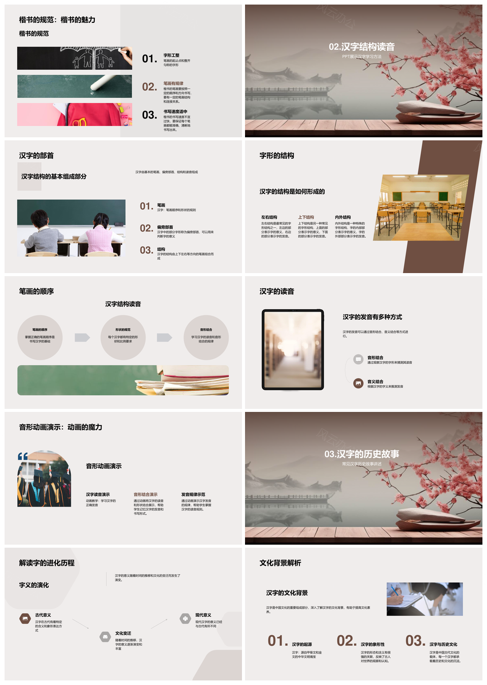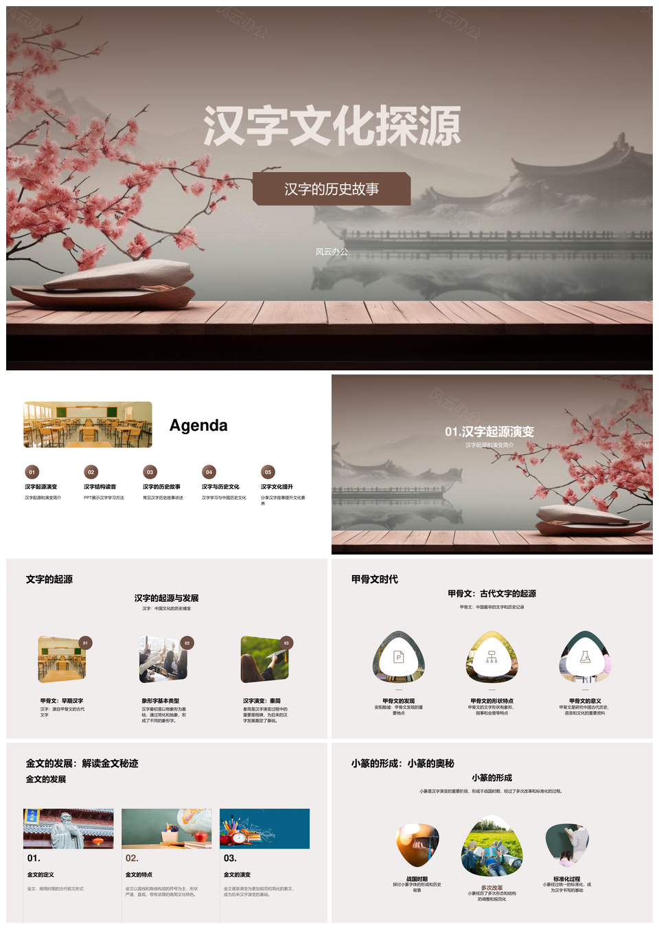 风云办公提供的汉字演变源流形音结构与书法文化探析PPT模板,下载格式为pptx,一共33页,作品中文字及图均可以修改和编辑,图片更改请在作品中右键图片并更换,文字修改请直接点击文字进行修改。