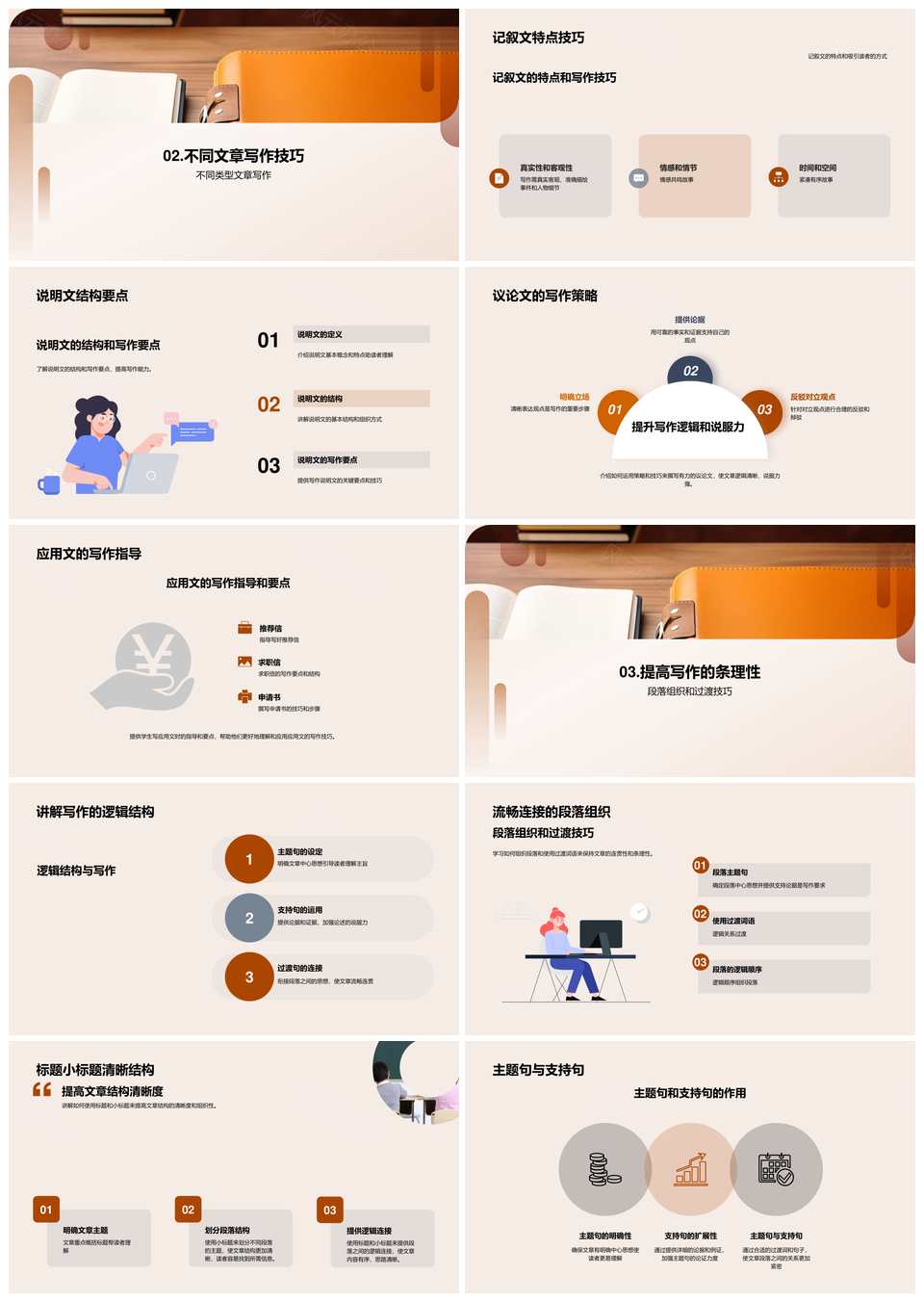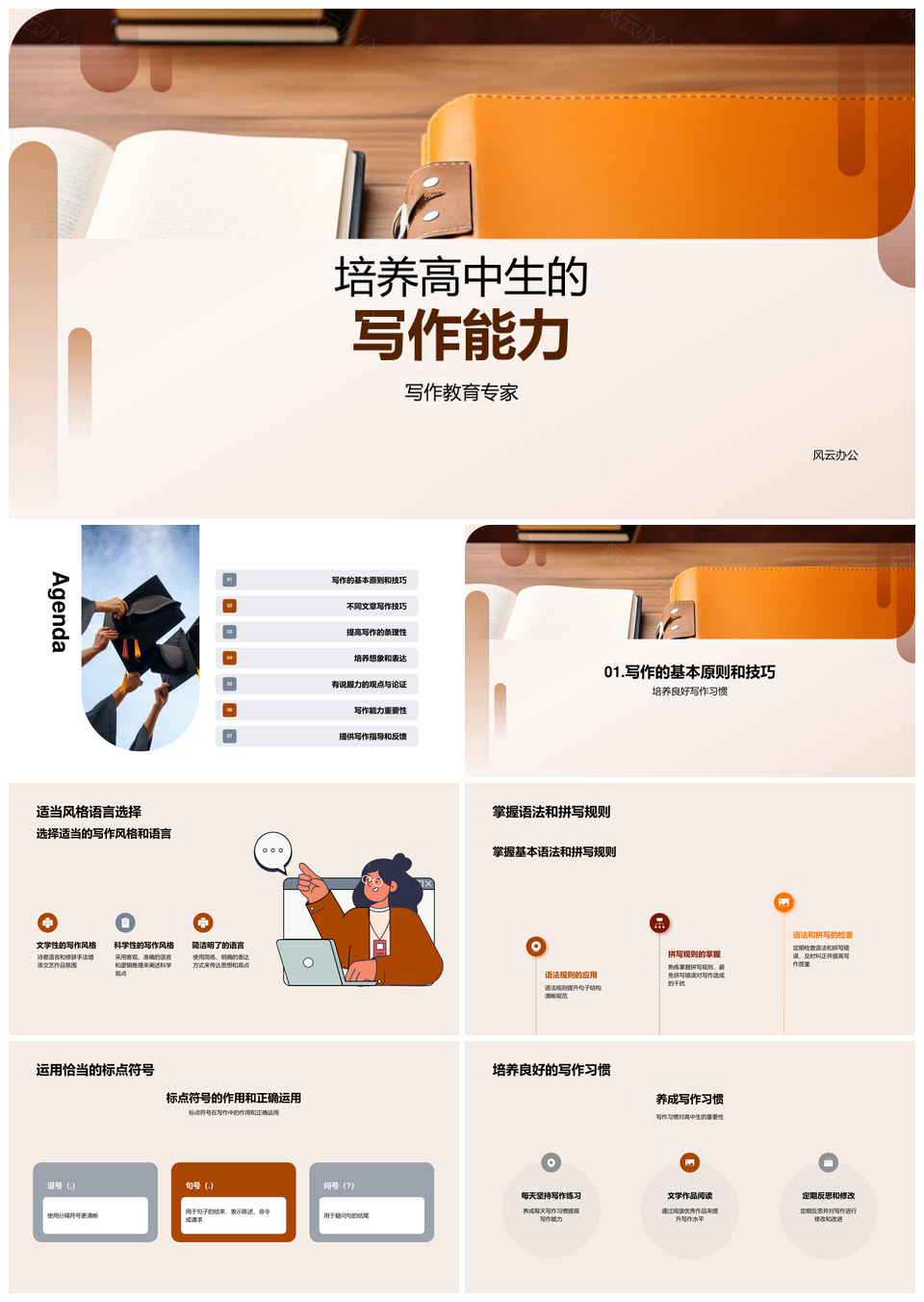 这是一张高中生写作能力培养技巧结构表达语法书籍PPT模板,包含高中生、写作能力、培养、技巧、结构、表达、语法、书籍等主题内容,也可用作高中生写作能力培养、写作能力培养技巧、能力培养技巧结构、培养技巧结构表达、技巧结构表达语法、结构表达语法书籍、高中生写作能力、写作能力培养、能力培养技巧、培养技巧结构、技巧结构表达、结构表达语法、表达语法书籍、高中生写作、能力培养等PPT场景使用。 风云办公提供的高中生写作能力培养技巧结构表达语法书籍PPT模板,下载格式为pptx,一共38页,作品中文字及图均可以修改和编辑,图片更改请在作品中右键图片并更换,文字修改请直接点击文字进行修改。