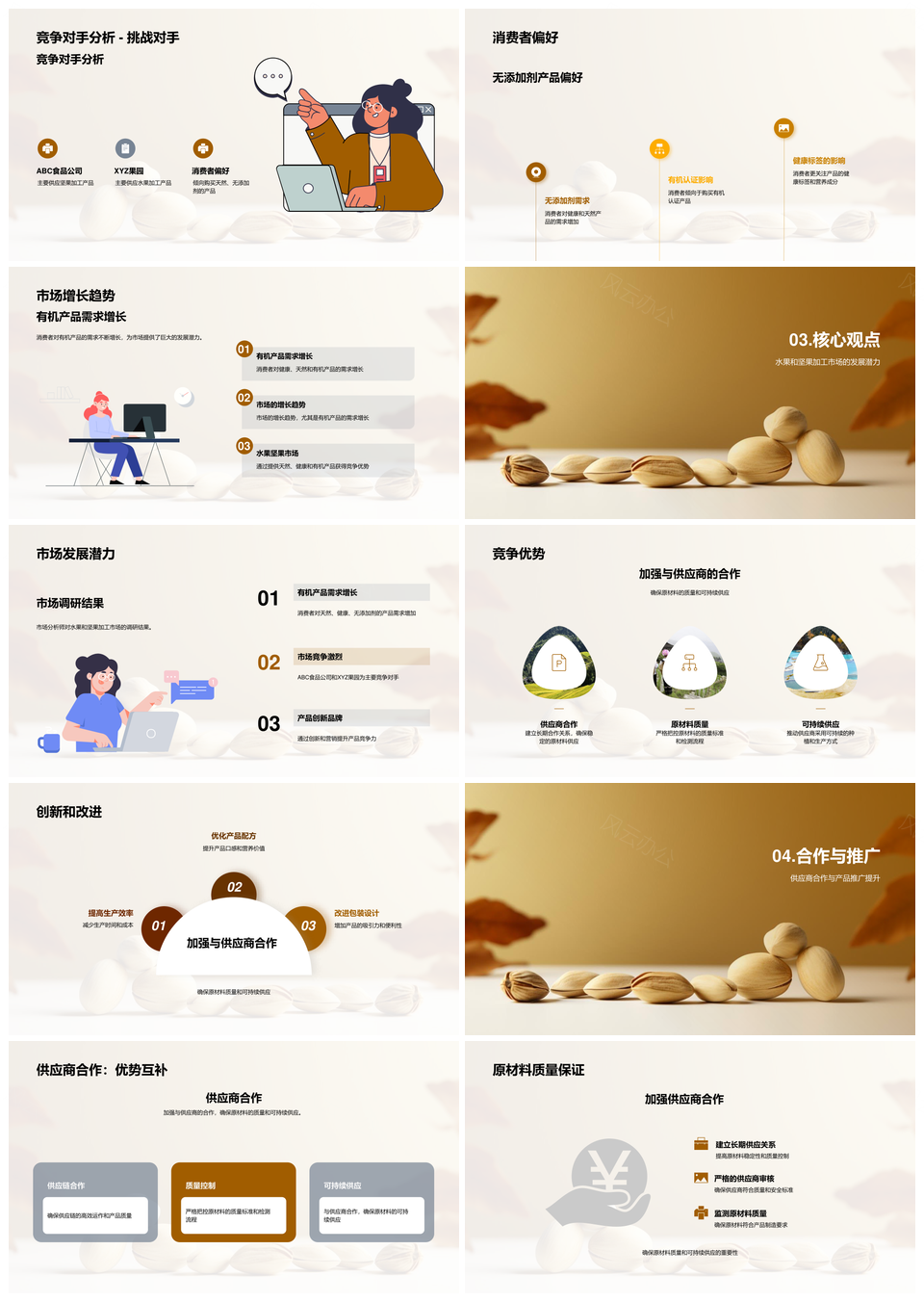 这是一张水果坚果加工市场农林规模多样竞争分析PPT模板,包含水果、坚果、加工、市场、农林、规模、多样、竞争、分析等主题内容,也可用作水果坚果加工市场、坚果加工市场农林、加工市场农林规模、市场农林规模多样、农林规模多样竞争、规模多样竞争分析、水果坚果加工、坚果加工市场、加工市场农林、市场农林规模、农林规模多样、规模多样竞争、水果坚果、坚果加工、加工市场等PPT场景使用。 风云办公提供的水果坚果加工市场农林规模多样竞争分析PPT模板,下载格式为pptx,一共23页,作品中文字及图均可以修改和编辑,图片更改请在作品中右键图片并更换,文字修改请直接点击文字进行修改。
