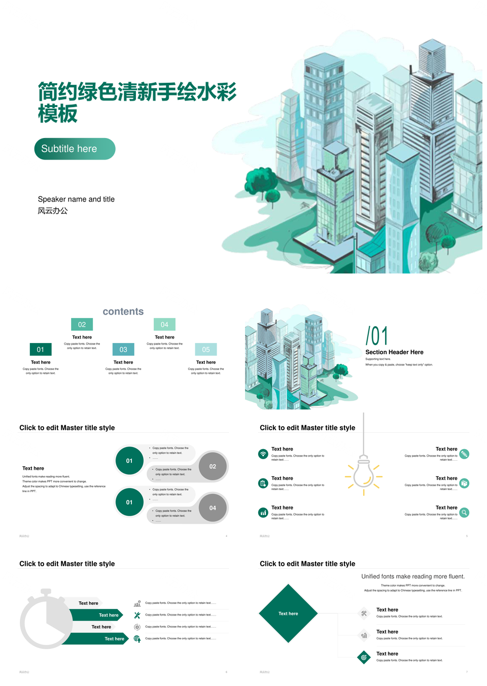 风云办公提供的绿色简约水彩手绘城市建筑答辩PPT模板,下载格式为pptx,一共32页,作品中文字及图均可以修改和编辑,图片更改请在作品中右键图片并更换,文字修改请直接点击文字进行修改。