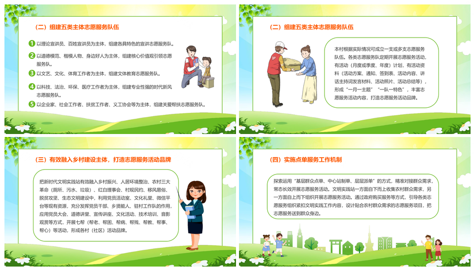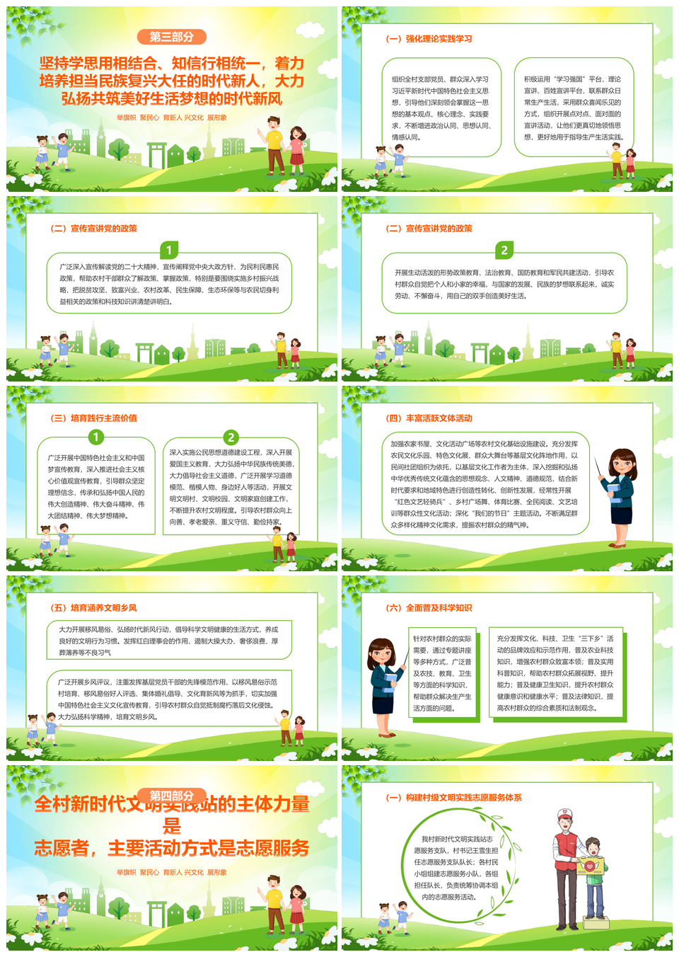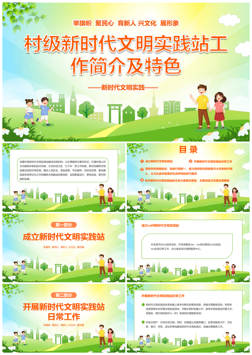 这是一张村级新时代文明站特色工作绿色清新展板PPT模板,包含村级、新时代、文明站、特色工作、绿色清新、展板等主题内容,也可用作村级新时代文明站特色工作、新时代文明站特色工作绿色、文明站特色工作绿色清新、特色工作绿色清新展板、村级新时代文明站、新时代文明站特色工作、文明站特色工作绿色、特色工作绿色清新、绿色清新展板、村级新时代、新时代文明站、文明站特色工作、特色工作绿色、绿色清新、清新展板等PPT场景使用。 风云办公提供的村级新时代文明站特色工作绿色清新展板PPT模板,下载格式为pptx,一共22页,作品中文字及图均可以修改和编辑,图片更改请在作品中右键图片并更换,文字修改请直接点击文字进行修改。
