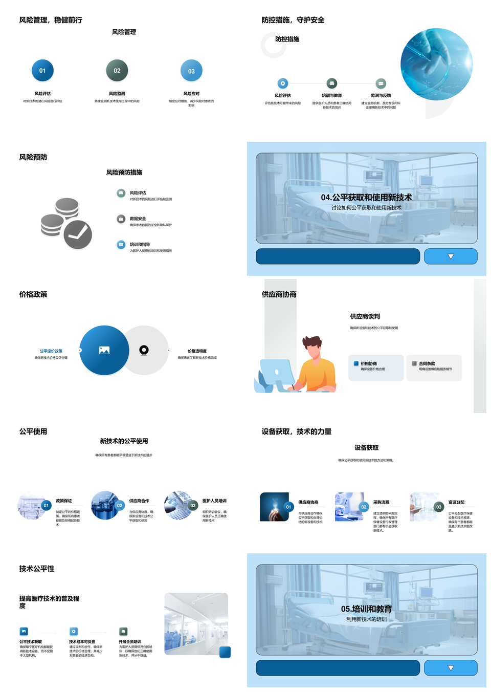 本模板专为智能医疗主题设计,主体采用蓝白双色搭配,传递洁净科技感与专业信赖度,模块化布局确保内容精准呈现。设计融入波粒动态元素与激光射线抽象图形,以极简线条模拟光粒轨迹,诠释医学与科技的理性碰撞。内置医疗场景图标库,涵盖诊断设备、数据分析、远程会诊等矢量素材,适配学术汇报、技术方案展示等场景。版式强调信息层级与留白平衡,逻辑图表支持数据可视化,降低观者认知成本,助力高效传递智能医疗领域的严谨性与创新价值。