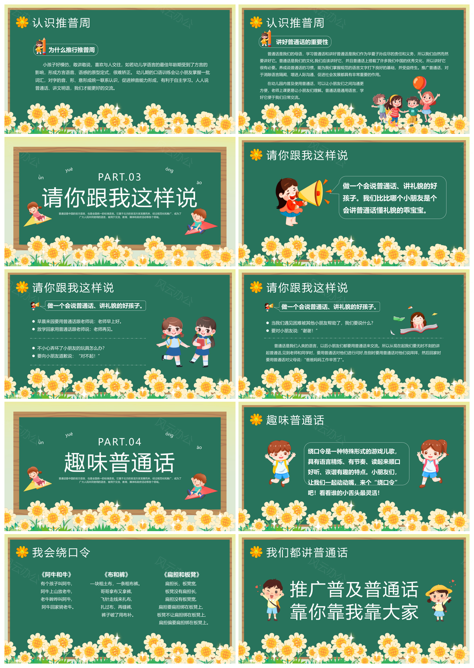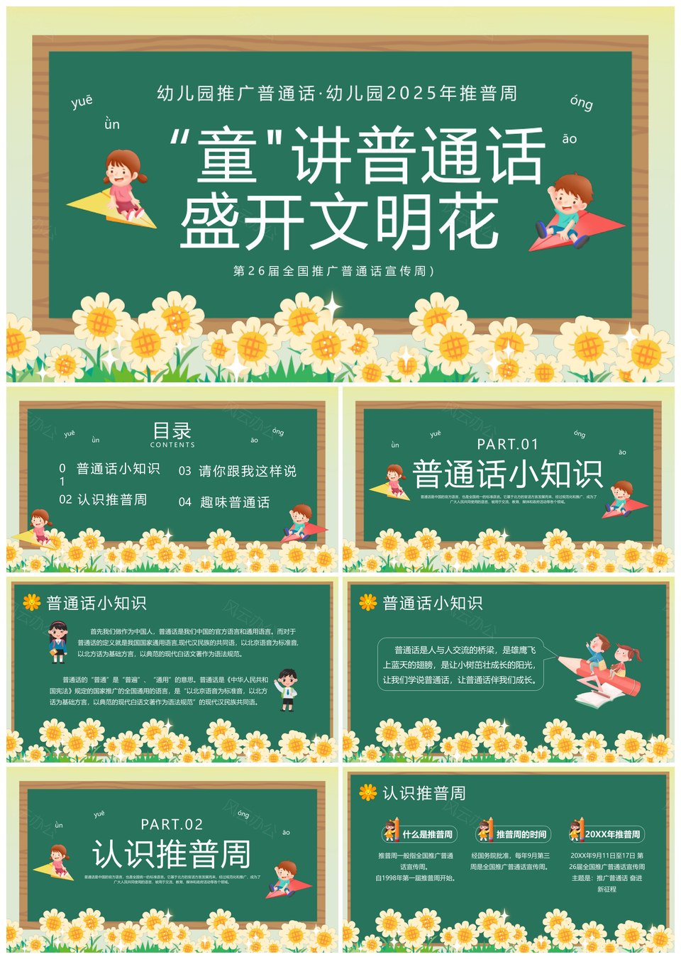 2025绿色卡通风幼儿园全国推普周主题班会PPT模板推荐