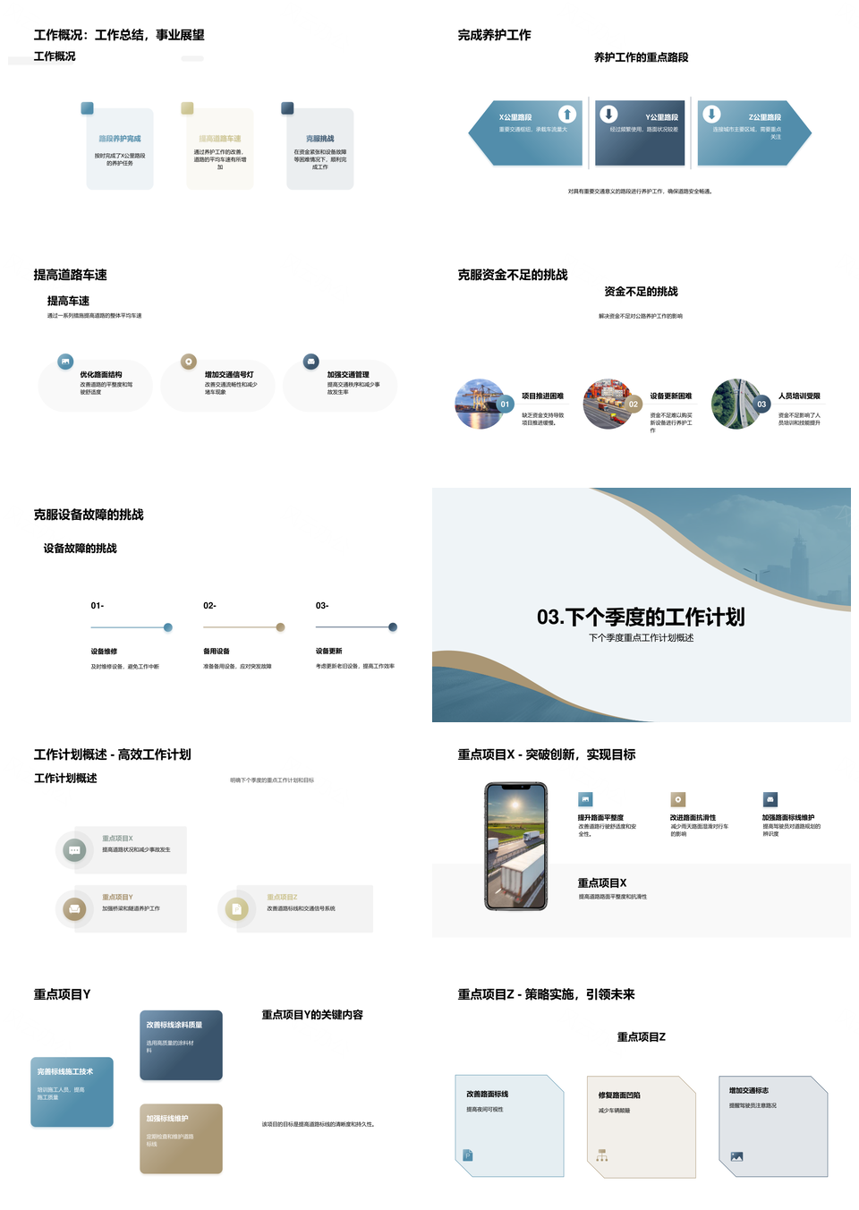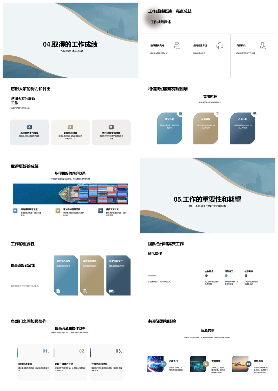 这是一张公路养护部门季度总结结构职责数据成就挑战PPT模板,包含公路养护部门、季度总结、结构、职责、数据、成就、挑战等主题内容,也可用作公路养护部门季度、养护部门季度总结、部门季度总结结构、季度总结结构职责、总结结构职责数据、结构职责数据成就、职责数据成就挑战、公路养护部门、养护部门季度、部门季度总结、季度总结结构、总结结构职责、结构职责数据、职责数据成就、数据成就挑战等PPT场景使用。 风云办公提供的公路养护部门季度总结结构职责数据成就挑战PPT模板,下载格式为pptx,一共30页,作品中文字及图均可以修改和编辑,图片更改请在作品中右键图片并更换,文字修改请直接点击文字进行修改。